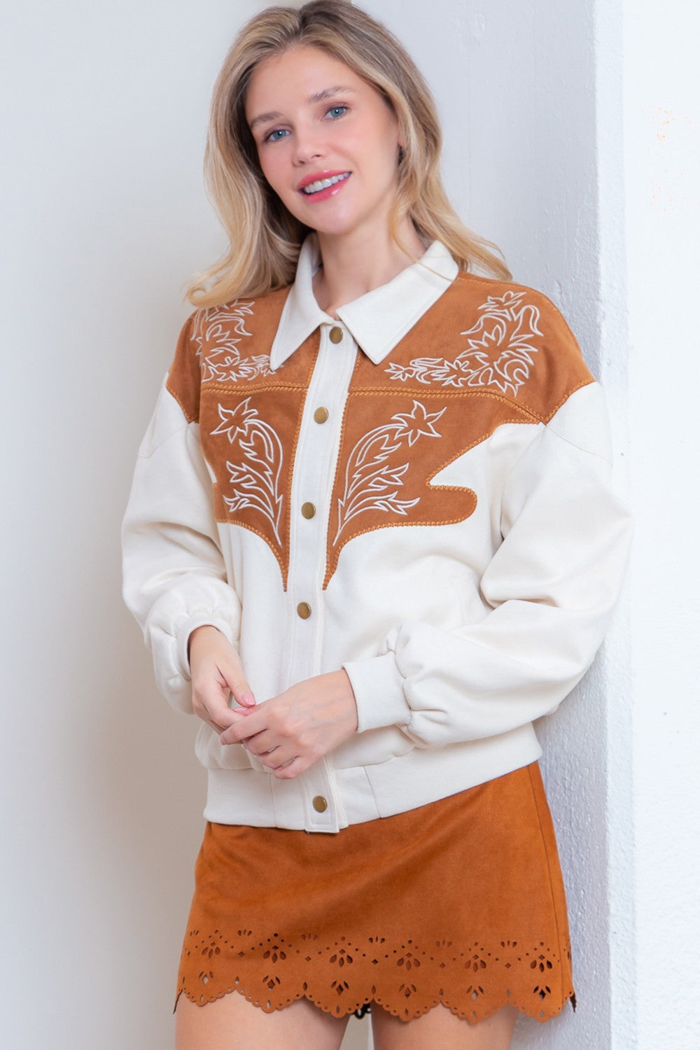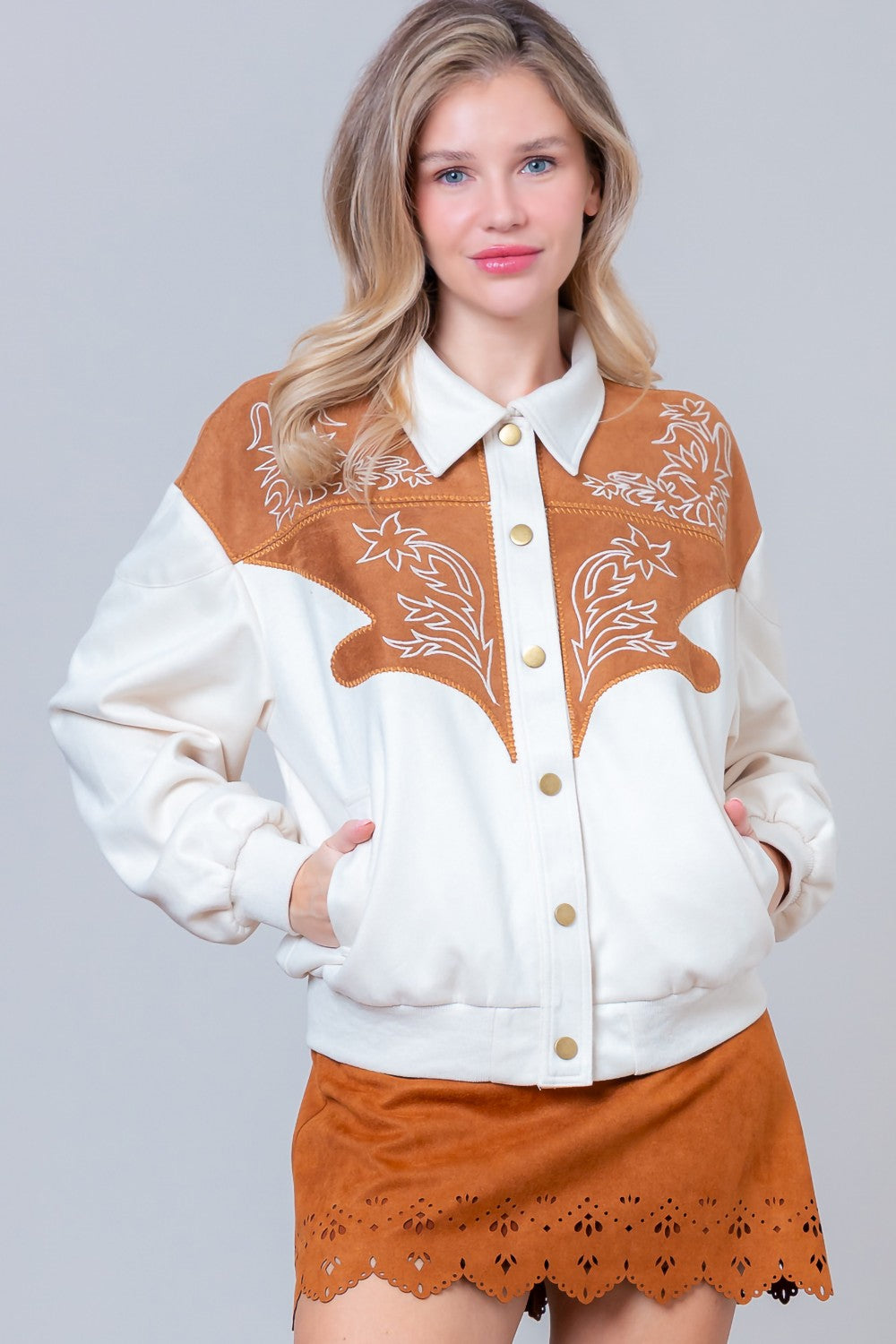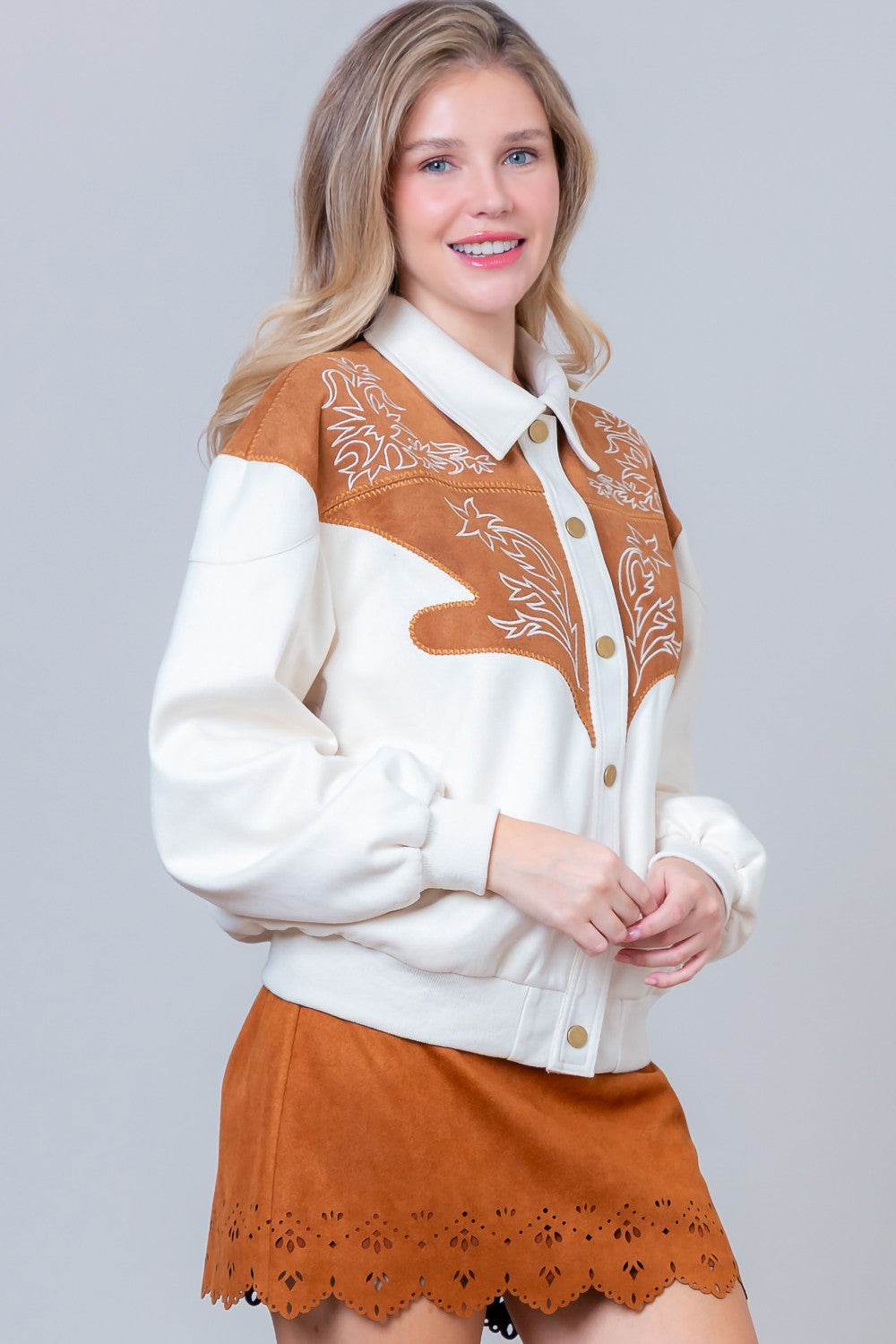 Elevate your western-inspired wardrobe with the Sierra Dawn Embroidered Western Jacket. This fitted, long-sleeve jacket features a soft two-tone design with intricate embroidery and snap-button closures for an effortlessly chic western vibe. Finished with a classic collared neckline, it pairs perfectly with jeans or skirts for a standout look that’s equal parts rugged and refined.