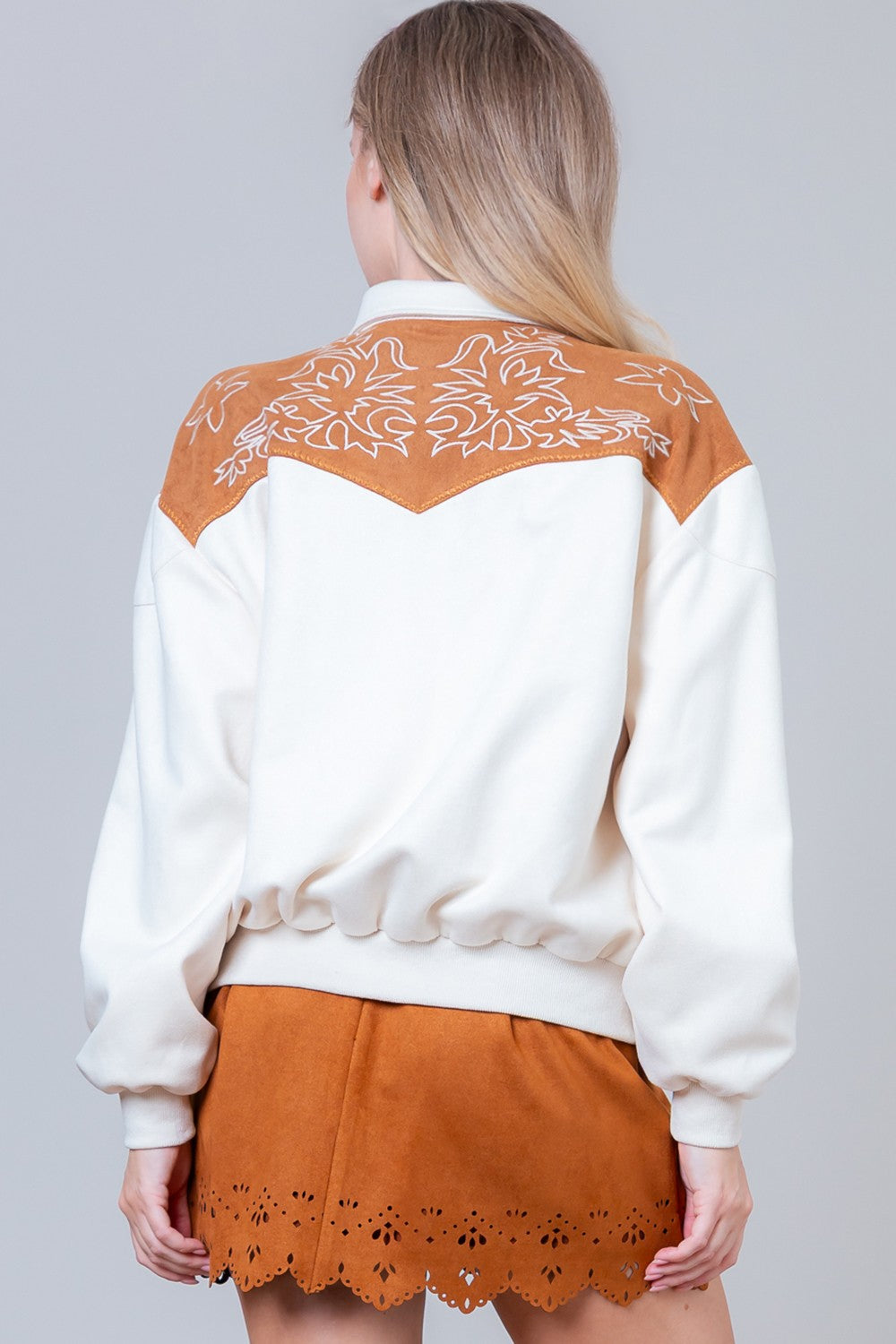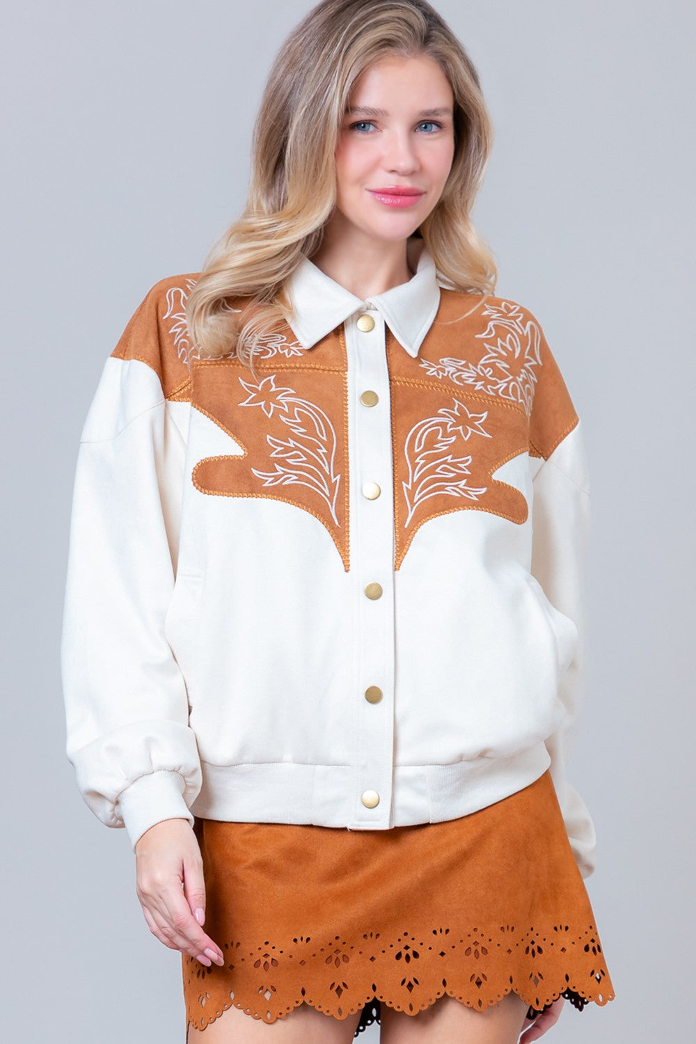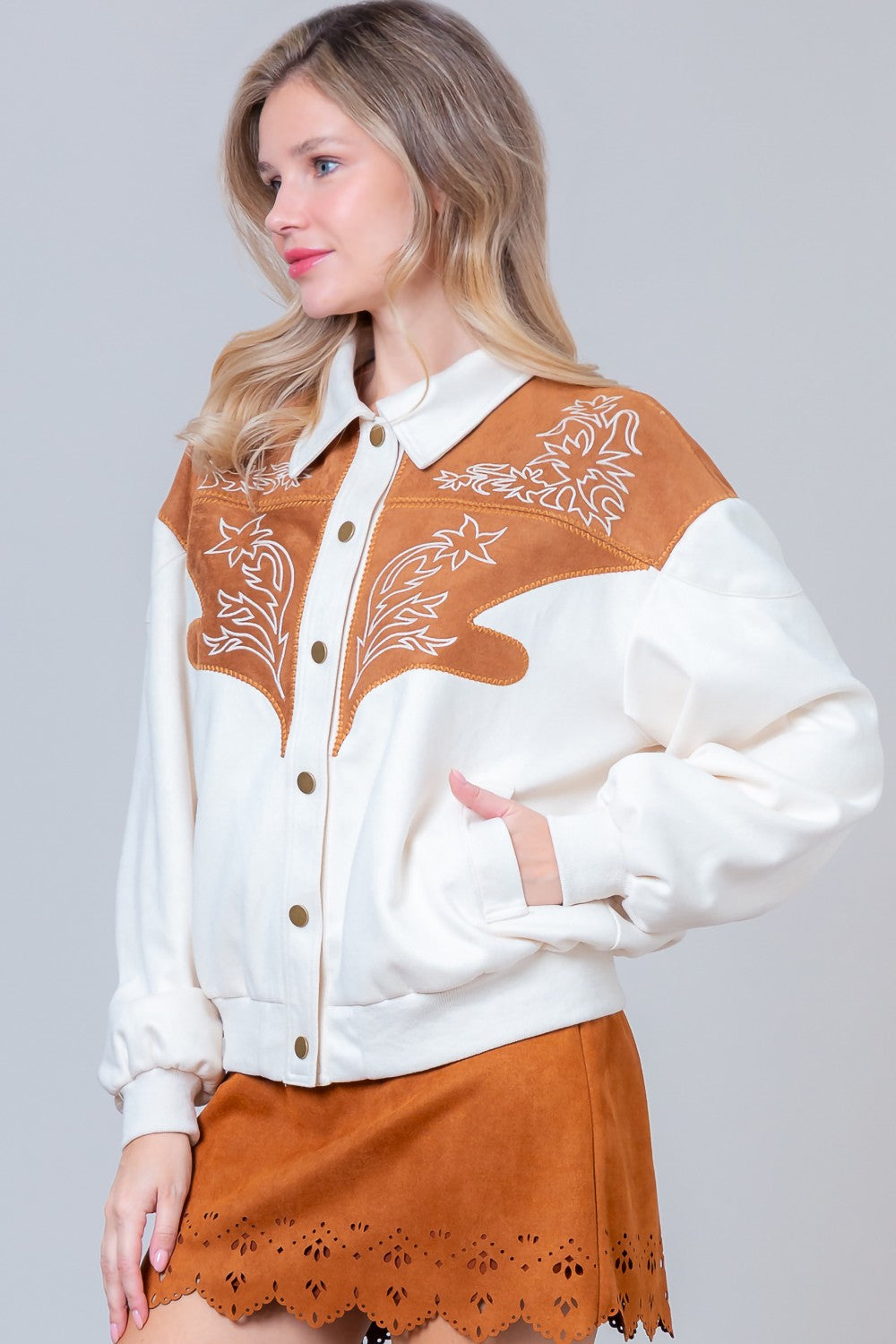 Elevate your western-inspired wardrobe with the Sierra Dawn Embroidered Western Jacket. This fitted, long-sleeve jacket features a soft two-tone design with intricate embroidery and snap-button closures for an effortlessly chic western vibe. Finished with a classic collared neckline, it pairs perfectly with jeans or skirts for a standout look that’s equal parts rugged and refined.