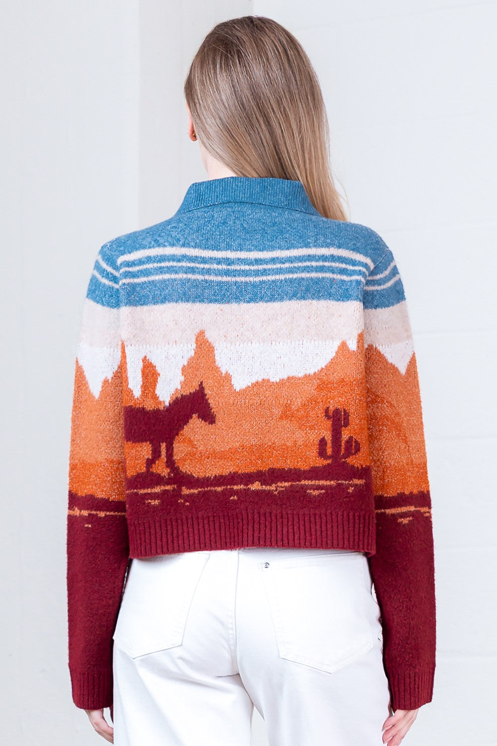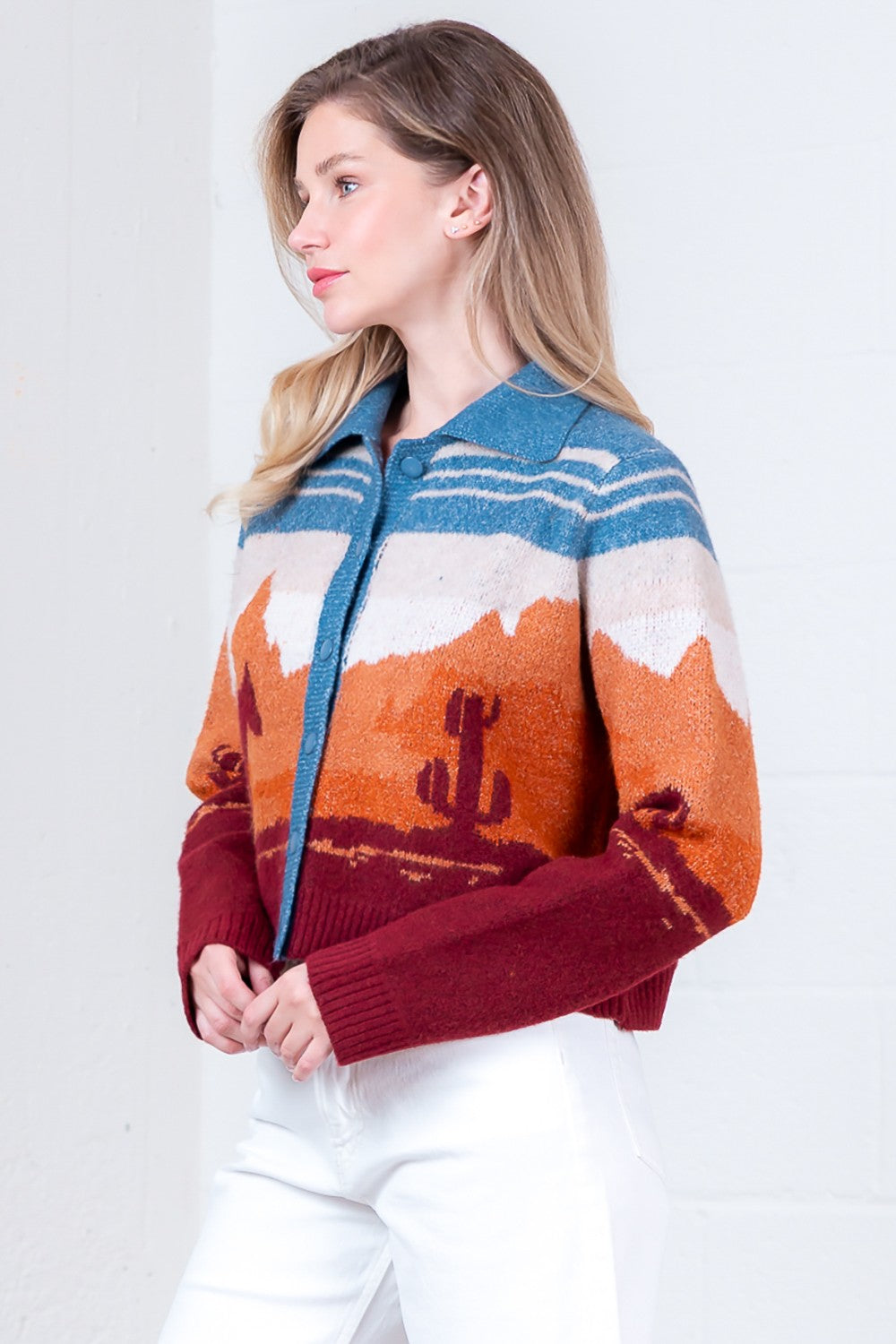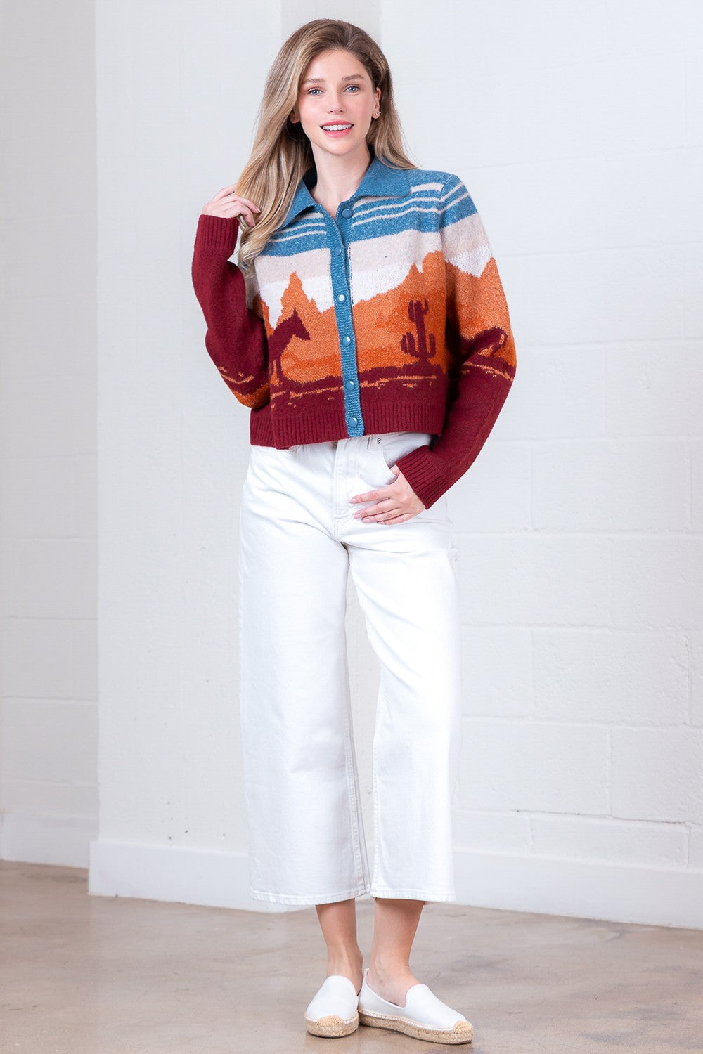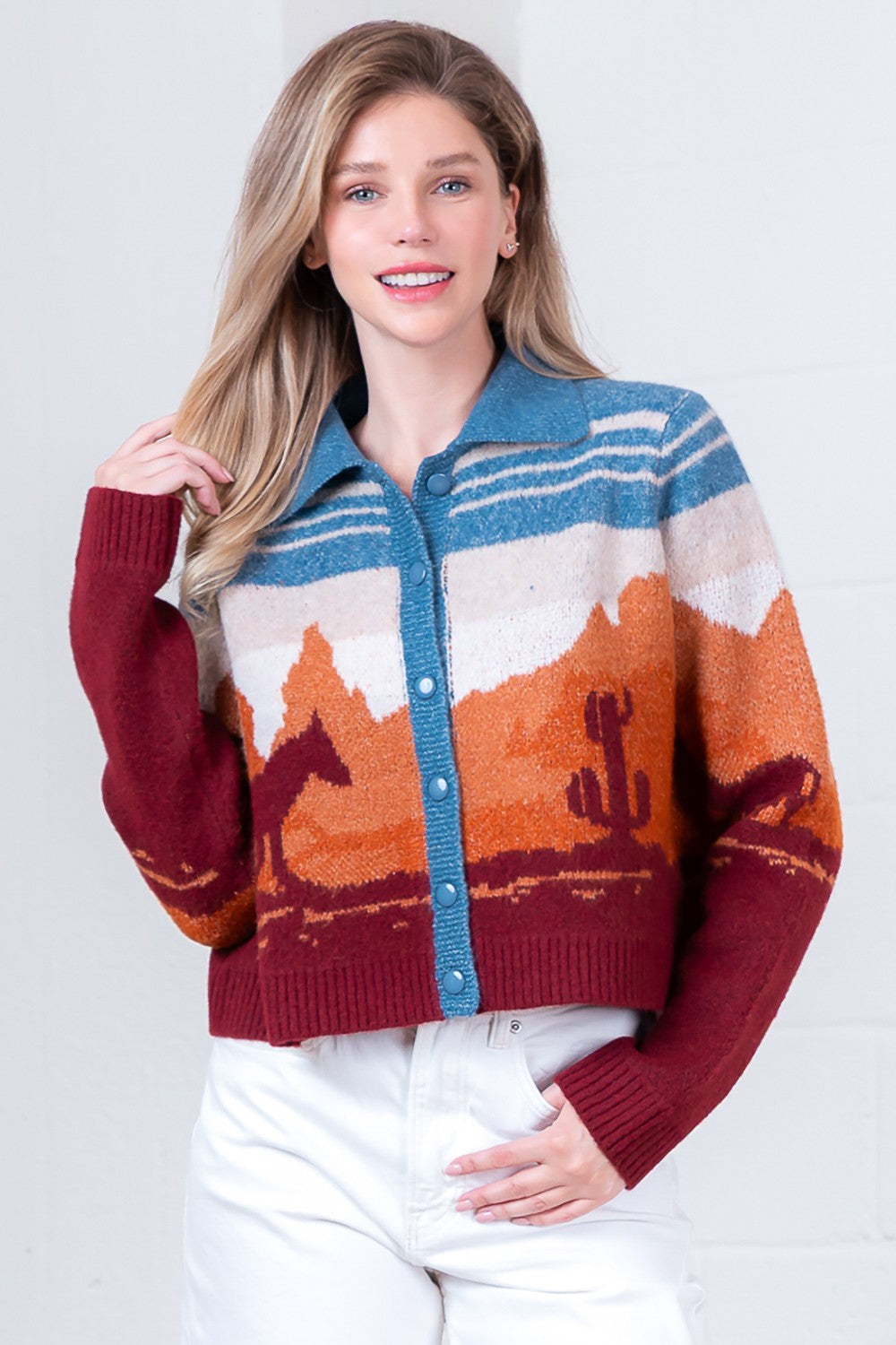 Bring rustic charm to your wardrobe with the Desert Horizon Western Sweater Cardigan. This cozy knit features a scenic western motif with mountains, a horseback rider, and a cactus, all woven into a soft, textured fabric. Designed with a cropped fit, long sleeves, and a comfortable silhouette, it’s perfect for layering over tees or dresses for a stylish, laid-back look with a touch of western flair.