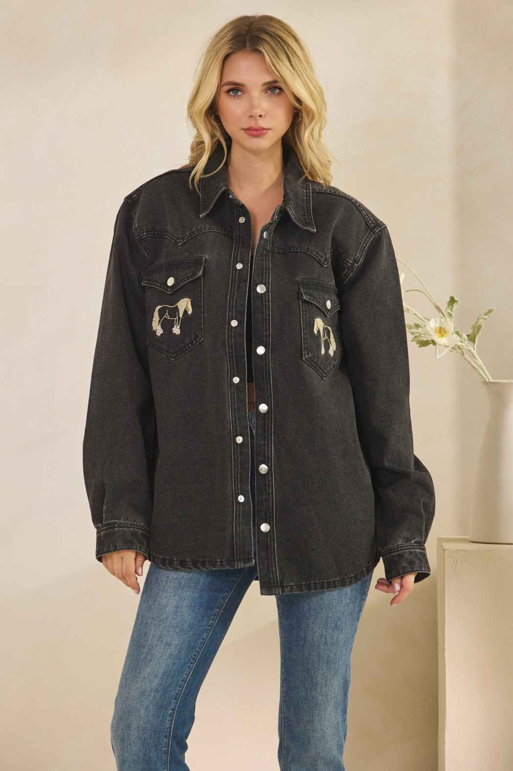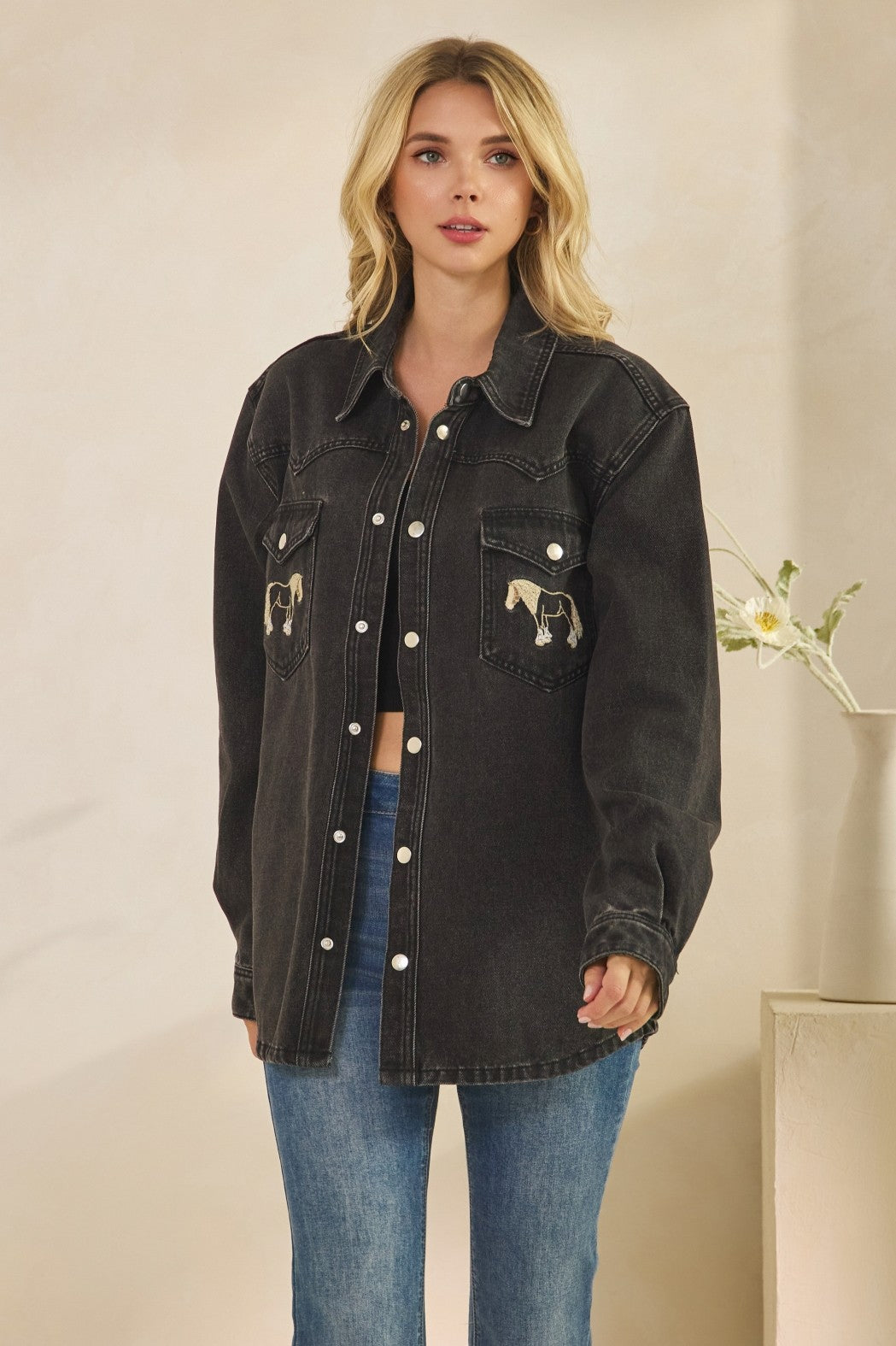 Add a touch of western charm to your wardrobe with the Equestrian Embroidered Denim Jacket. This classic snap-button jacket features detailed horse embroidery on the front pockets, giving it a unique, boutique-inspired look. Crafted from durable denim, it’s perfect for layering over dresses, skirts, or casual outfits, bringing a stylish, playful nod to equestrian style wherever you go.