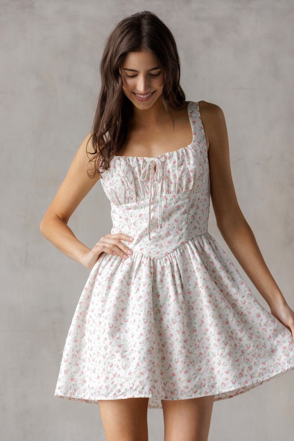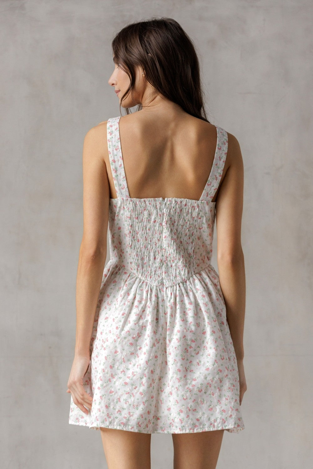 Feminine and flirty, the Romantic Blooms Mini Dress is your new go-to for warm-weather days. Designed with a sweetheart neckline and a gathered bust accented by a delicate front tie, this dress brings soft, romantic charm to every step. Wide shoulder straps and a squared back add structure, while a smocked back panel ensures a flexible, comfortable fit. The allover soft pink floral print on a crisp white base gives it a timeless, fresh feel. Finished with a high-waisted seam and a breezy flared mini skirt, it’s perfect for brunch dates, garden parties, or sunny strolls.