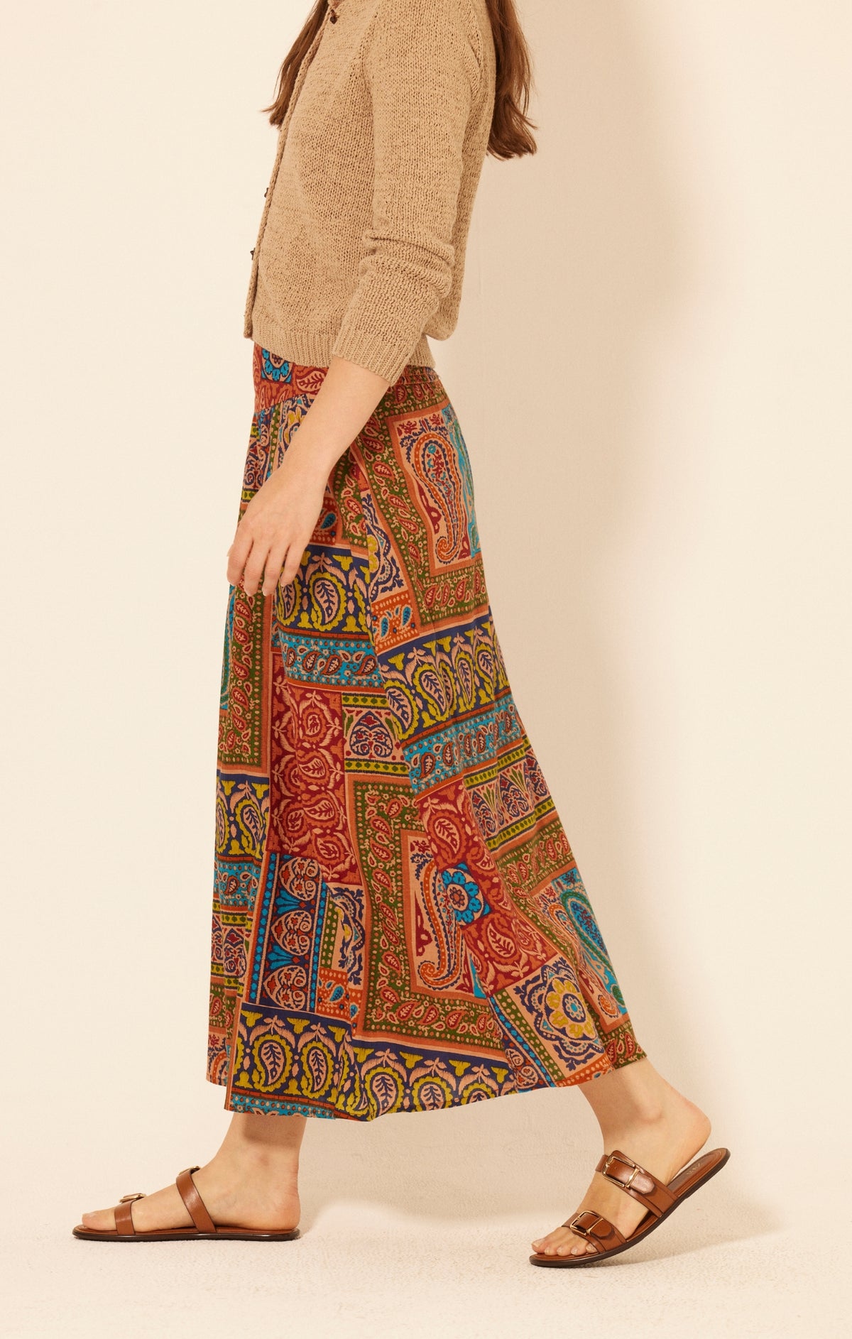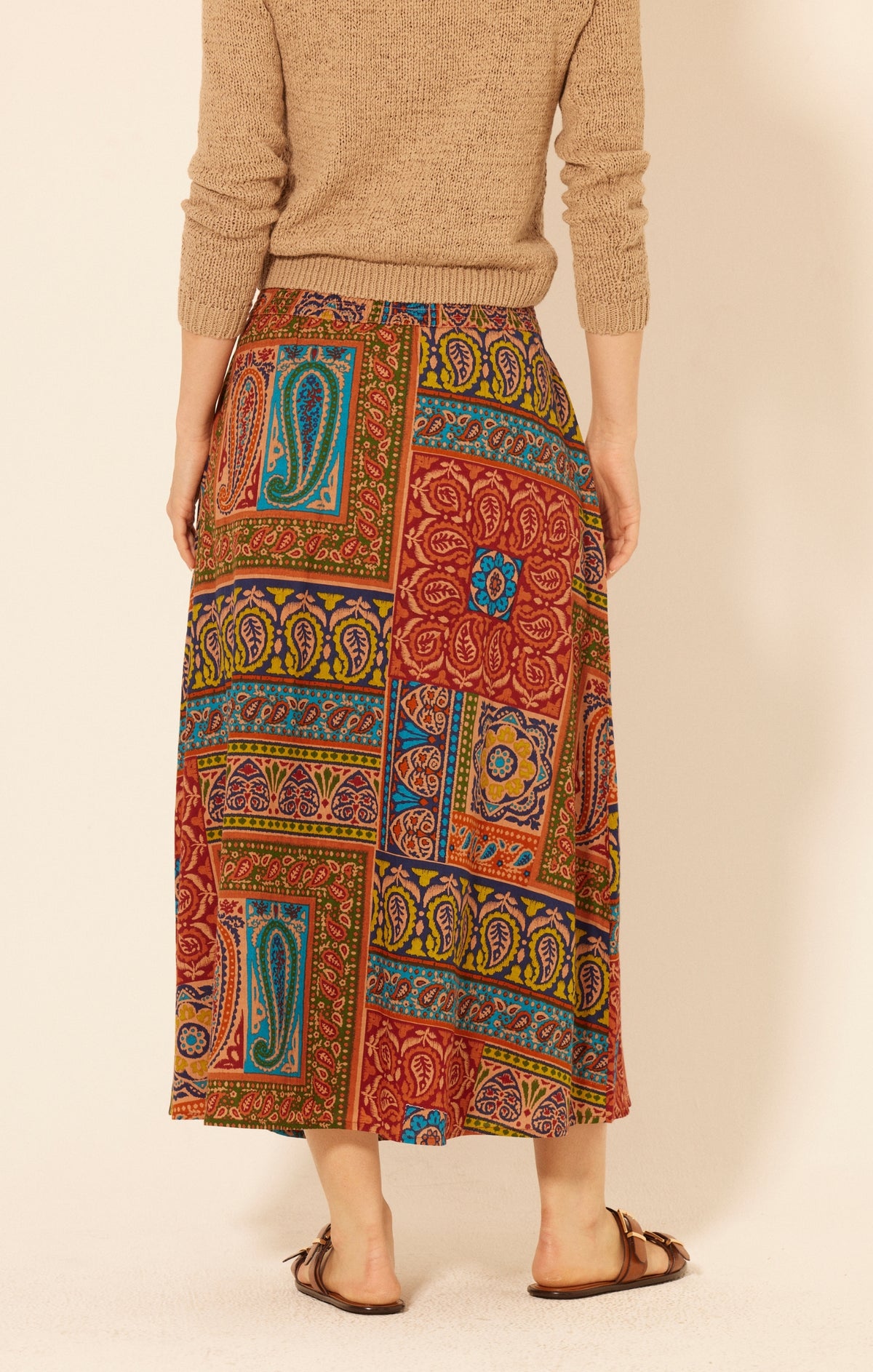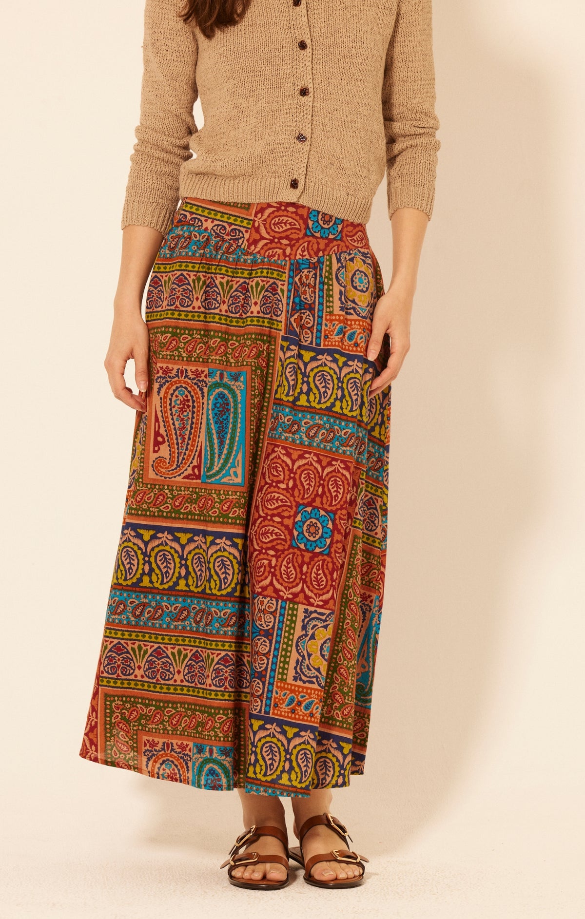 Step into effortless bohemian style with the Elm Maxi Skirt. Designed in a vibrant patchwork-inspired print, this flowy skirt features bold paisley and floral motifs in earthy tones with pops of turquoise and gold. Its relaxed silhouette and ankle-grazing length make it perfect for both everyday wear and weekend getaways. Pair it with a cozy knit or a breezy blouse for a look that’s equal parts comfortable and chic.