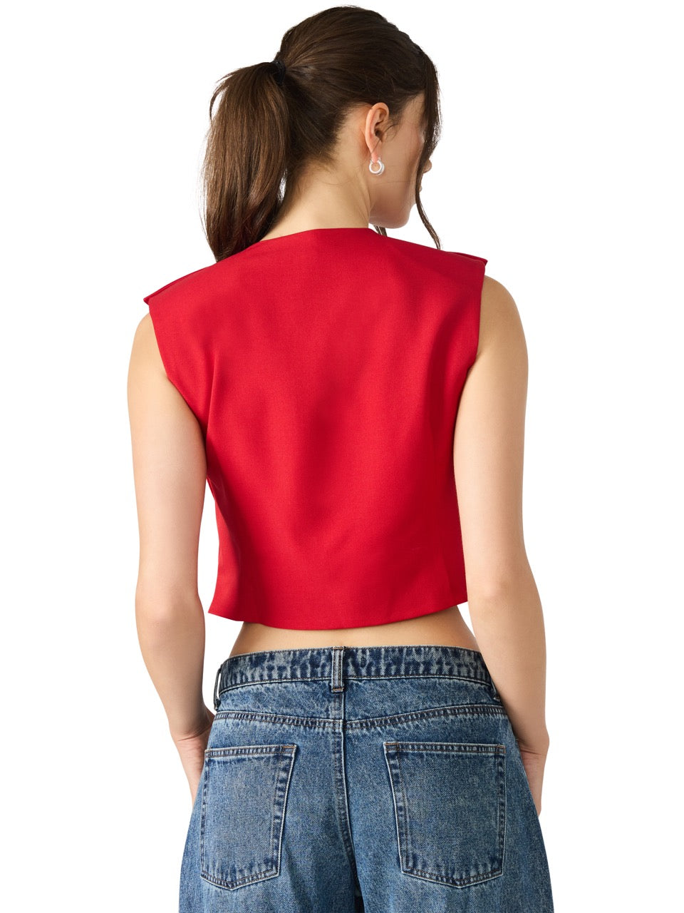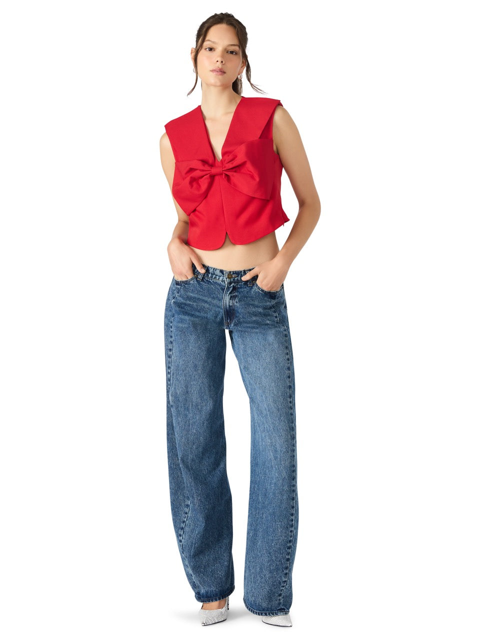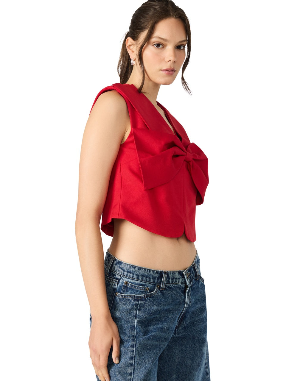 Turn heads with the Steve Madden Ayanna Twist Front Top. Its dramatic deep V-neck and oversized bow add a playful twist to your look, while the cropped hem pairs perfectly with high-rise jeans or flowy wide-leg pants. Lightweight and sleek, this top is your new favorite for everything from downtown outings to date nights where you want to make a stylish statement.