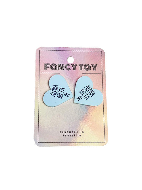 Celebrate Alpha Delta Pi with these playful sweetheart studs. Featuring a heart-shaped design in light blue etched on royal blue acrylic, these earrings are available in a bold or simple design that style effortlessly. The secure post backs make them comfortable for all-day wear, adding a fun and charming touch to your sorority spirit.