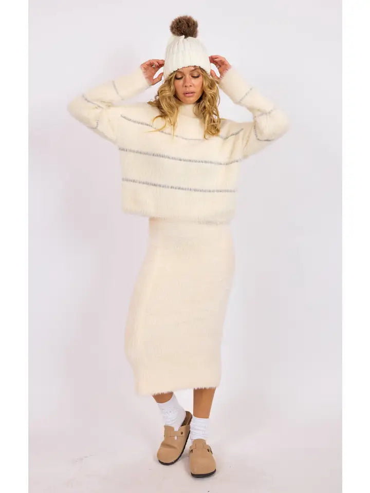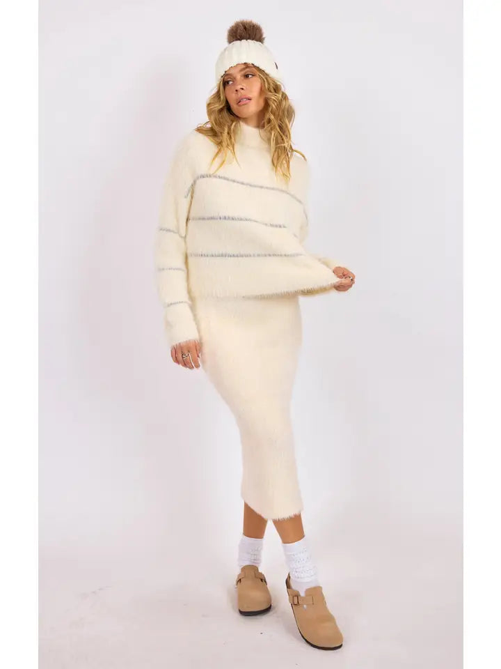 Wrap yourself in effortless elegance with this turtleneck sweater that strikes the perfect balance between cozy comfort and eye-catching style. The shimmering silver metallic stripe weaves through the design, elevating your everyday look with just a hint of glamour. Whether you're layering for winter or reaching for a go-to piece that works with everything in your closet, this sweater delivers warmth, texture, and that special sparkle that makes you feel fabulous.