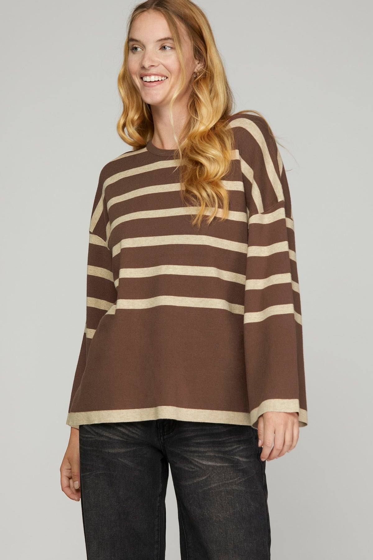 Cozy up in style with the Mocha Drift Striped Sweater. This long-sleeve knit features classic stripes in warm mocha tones, paired with a comfortable round neckline for an effortlessly chic look. Soft, cozy fabric makes it perfect for layering over jeans or skirts, while the relaxed fit ensures all-day comfort. A versatile, seasonal essential that brings subtle pattern and warmth to your fall wardrobe.