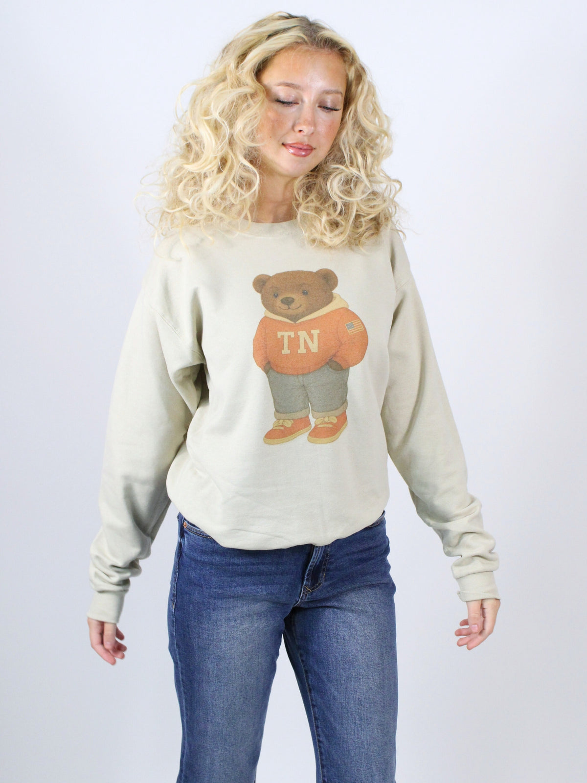 Stay cozy and cute in the TN Bear Crewneck Sweatshirt featuring an adorable teddy bear sporting a UT sweater on the front. Perfect for showing off your playful spirit while keeping warm, this sweatshirt combines comfort with a fun, charming design that brightens any outfit.