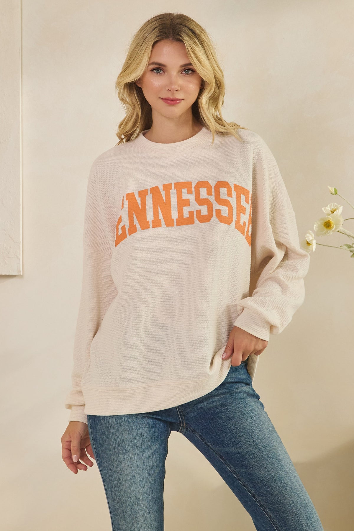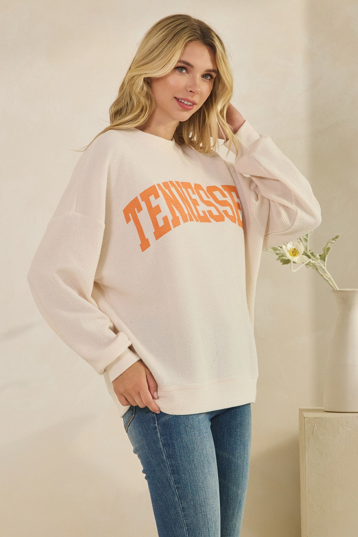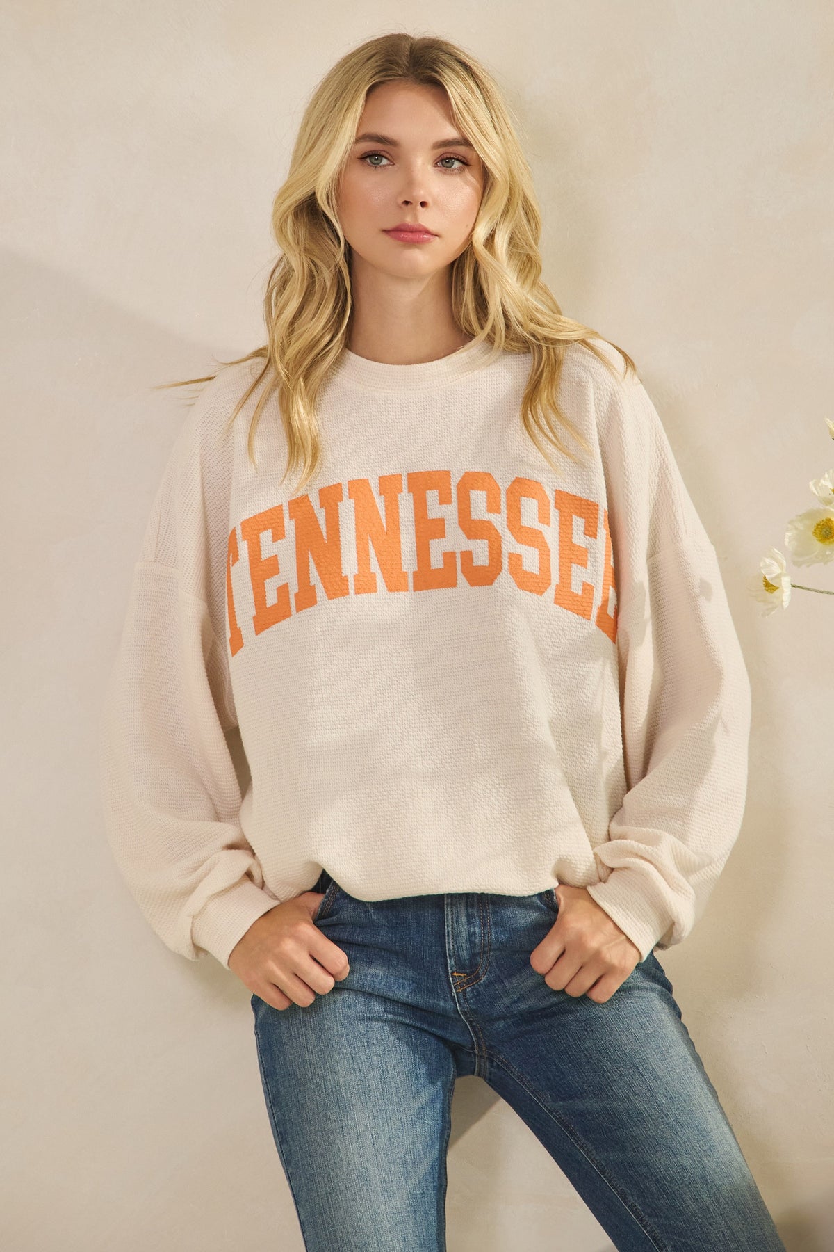 Cozy, casual, and perfectly Tennessee. The TN Cloudy Knit Top features a soft textured knit with an oversized fit for effortless comfort. Designed in a creamy neutral hue with bold orange “Tennessee” lettering across the front, it’s the ultimate throw-on-and-go piece for game days, lounging, or everyday wear. Lightweight yet cozy, this top keeps you stylish while showing off your Volunteer pride.