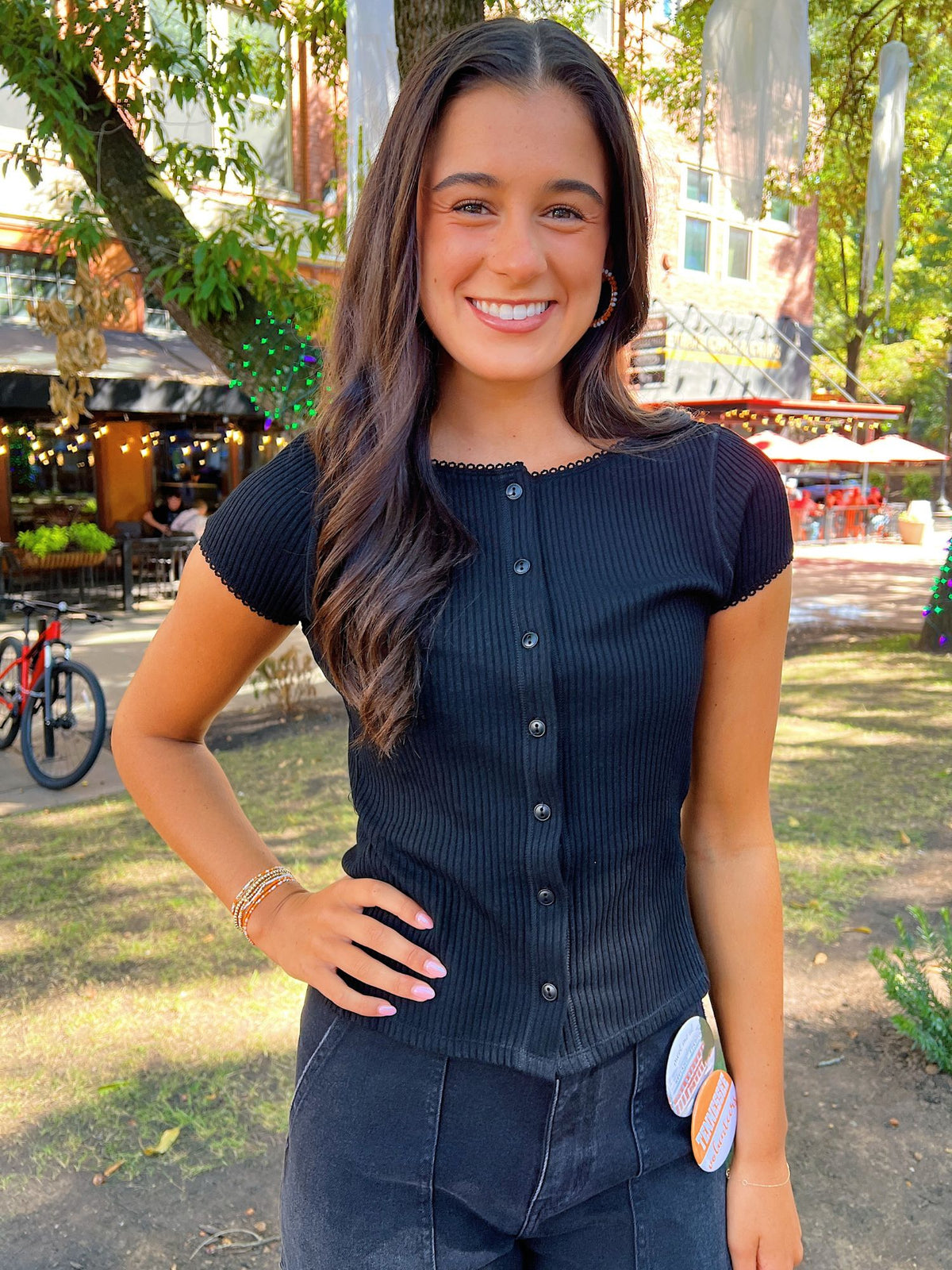 This adorable shrunken cardigan hugs you in a ribbed knit with charming capped sleeves and buttons running down the front. Its form-fitting, full-length design features a crew neckline and delicate picot trim, making it a sweet and stylish layering piece. Perfect for adding a touch of dainty flair to any outfit, this cardi is a playful staple you'll reach for again and again.