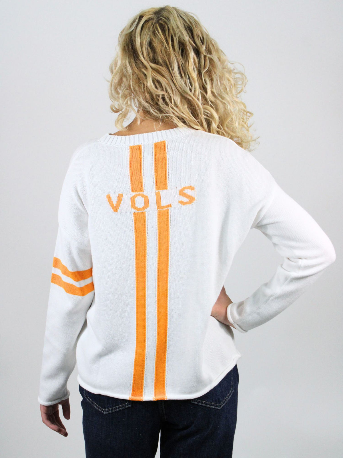 Celebrate your Volunteer pride with the TN Vols Crew Sweater, the ultimate game day companion! Decked out with the iconic Power T and sporty sleeve stripes, this cozy sweater brings Tennessee spirit to life. Its relaxed fit and classic V-neck make it easy to layer and cheer on the Vols in comfort and style all season long. Rock Rocky Top in cozy confidence wherever you go!