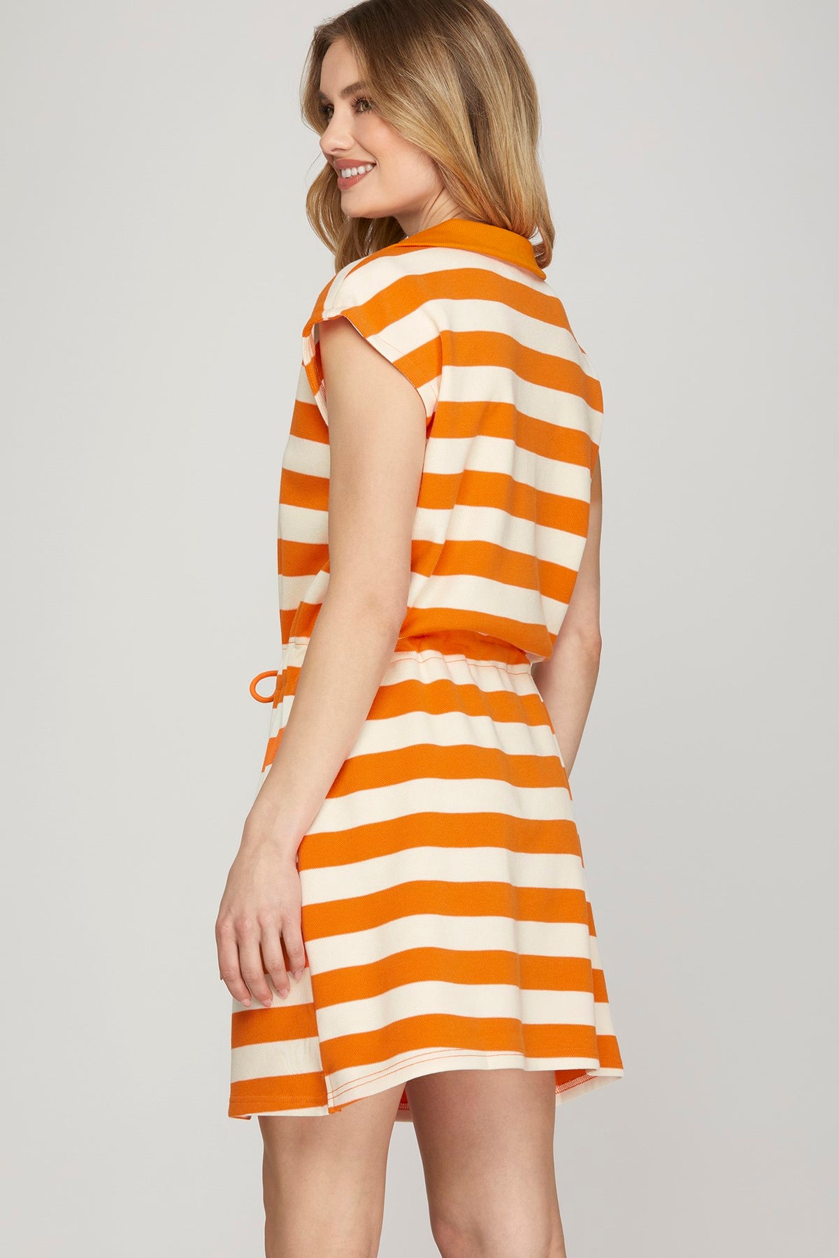 Cheer on the Vols in style with the Game Day Striped Zip-Up Mini Dress. Designed in bold orange and white stripes, this collared knit dress features sporty drop sleeves, a front zip closure, and a drawstring waist for the perfect fit. Finished with functional pockets, it’s both practical and spirited—ideal for tailgates, stadium seats, or celebrating a Tennessee win. Pair with sneakers or boots for an effortlessly game day-ready look.