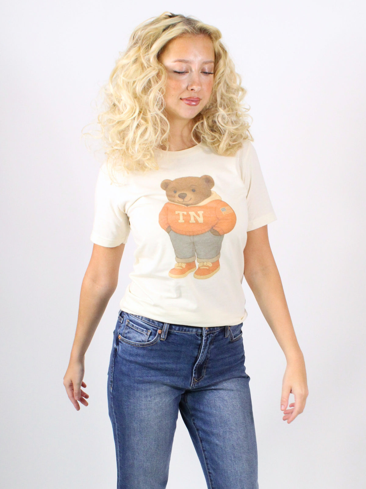 Bring some charm to your wardrobe with the TN Bear Short Sleeve Tee. Featuring an adorable teddy bear sporting a cozy TN sweater, this playful design adds a touch of whimsy to your casual look. Made for comfort and fun, it’s perfect for those who love a cozy, cute vibe every day.