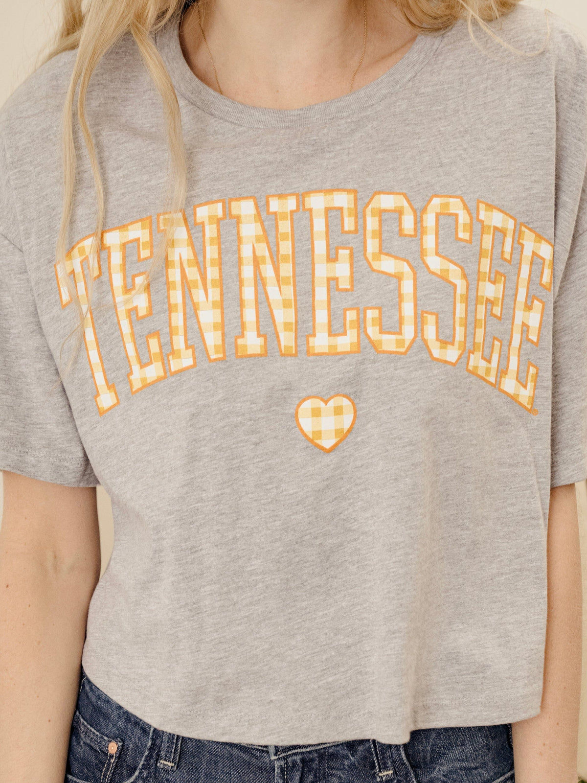 Show your Volunteer spirit with the cutest twist on a classic! The LivyLu Tennessee Gingham Heart Crop Tee features bold "TENNESSEE" lettering in an orange gingham print with a matching heart detail underneath. Made from soft, lightweight fabric in a relaxed, cropped fit—this tee is perfect for tailgates, campus strolls, or cheering on the Vols in style.