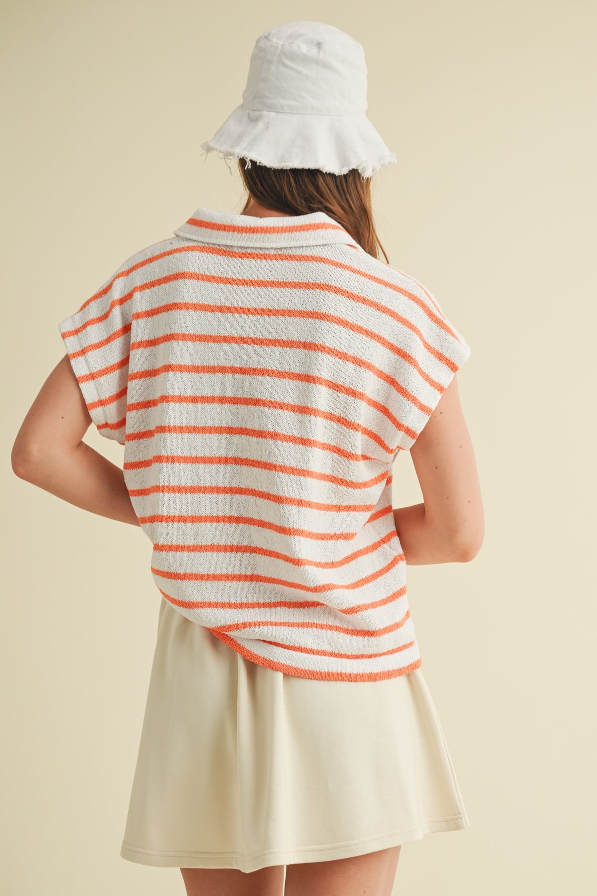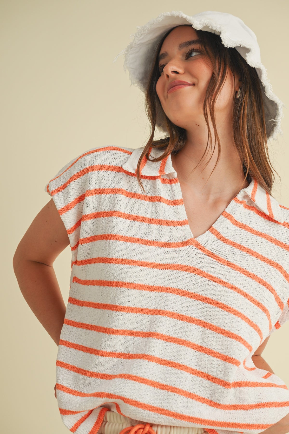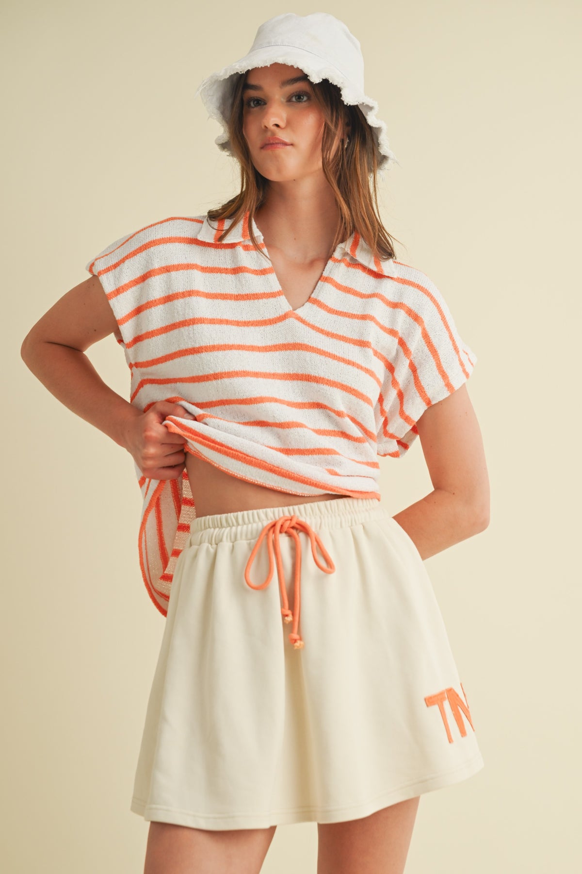 Bring effortless style to your game day look with our Game Day Striped Collared V-Neck Top. Featuring bold orange and white stripes with a relaxed fit, this lightweight knit top is both comfy and spirited. The collared neckline and sleeveless design add a touch of polish while keeping it casual—perfect for pairing with shorts, skirts, or joggers. Whether you’re tailgating, cheering from the stands, or just showing your Tennessee pride, this top is an easy win for any occasion.