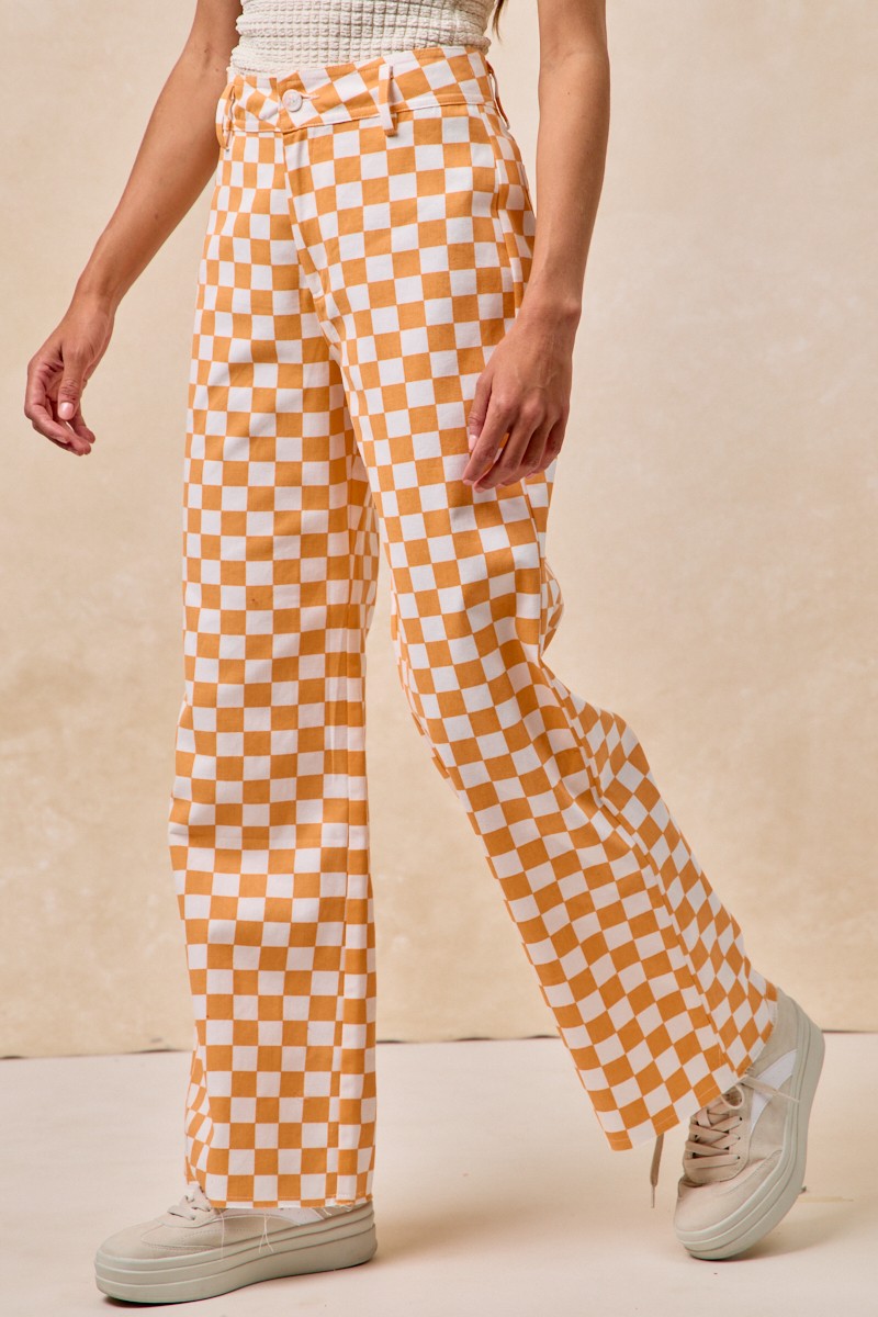 Stand out in true Tennessee style with our Rocky Top Checkerboard Pants. Featuring the iconic orange and white checkerboard print, these high-rise, straight-leg pants are the ultimate statement piece for gameday and beyond. The structured waistband with belt loops and a tailored fit keeps them polished, while the bold pattern brings all the spirited energy you need to cheer on the Vols. Pair with a simple top or go all out in full checkerboard pride—either way, you’ll be turning heads from kickoff to the final whistle.