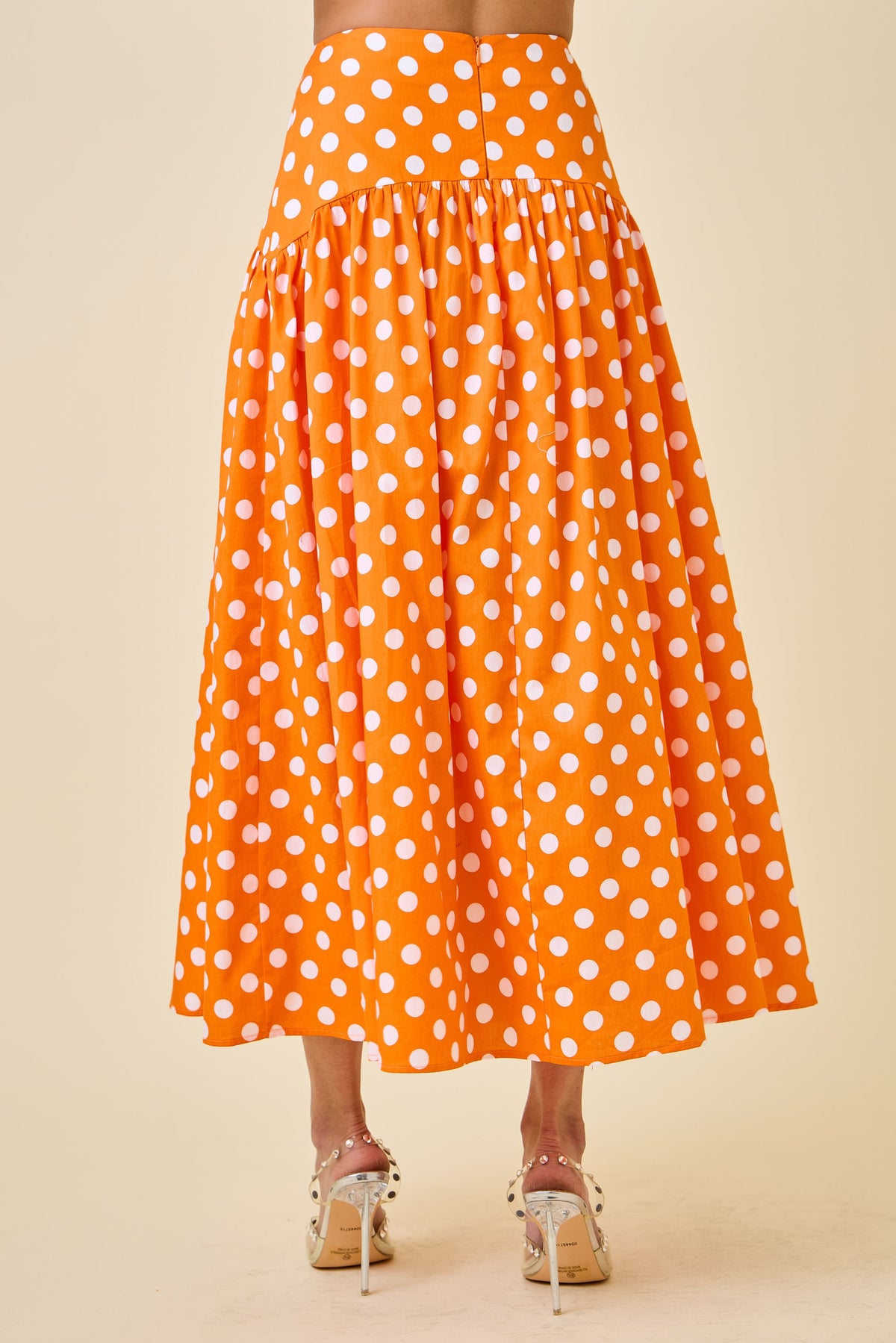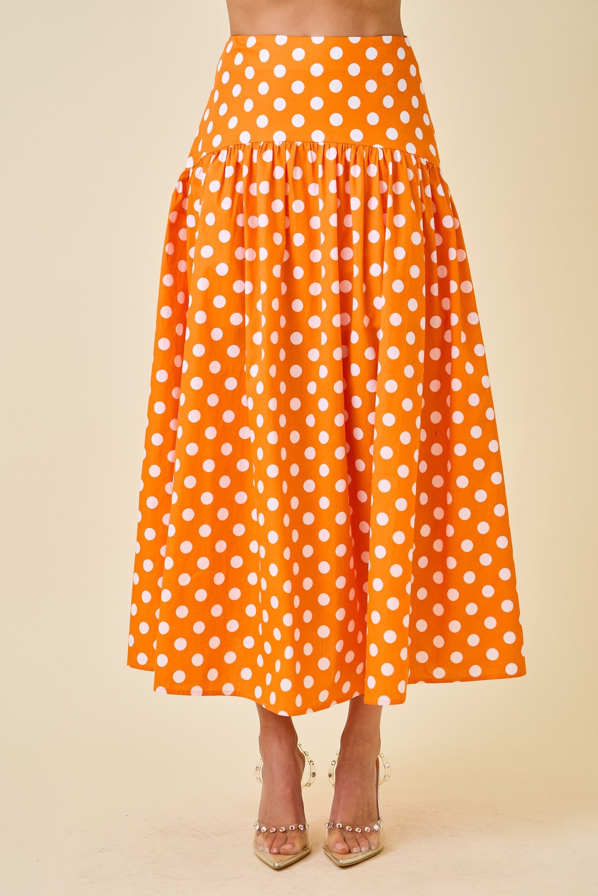 Turn heads on game day in the Rocky Top Polka Dot Maxi Skirt. Designed with a flared silhouette and curved yoke for a flattering fit, this orange-and-white beauty brings playful charm to your Volunteer style. Pair it with the matching top for the ultimate coordinated look that’s bold, breezy, and perfect for showing your Tennessee spirit.