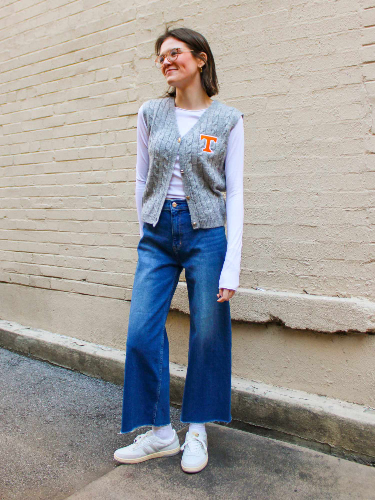 Layer up in style with this grey sweater vest featuring a bold Tennessee Orange Power T patch on the corner—your new gameday essential. Perfect for staying cozy during chilly weather while showing off your team spirit. Whether you're tailgating or cheering from the stands, this versatile piece keeps you warm and game-ready all season long.