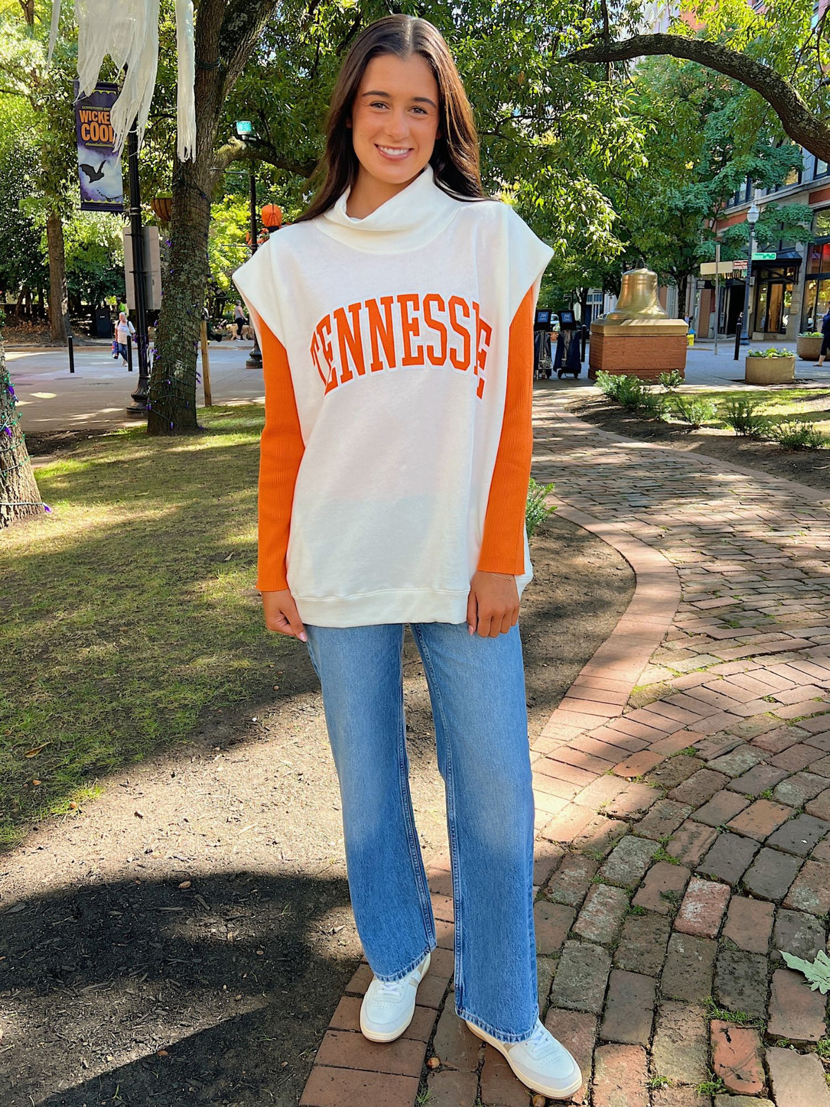 Show your team spirit in style with this Tennessee Oversized Muscle Top. Featuring bold orange TENNESSEE lettering across the front, this sleeveless top boasts extra-large armholes for a relaxed, airy fit. Perfect for game day or casual outings, its roomy cut keeps you cool while turning heads with vibrant school pride.