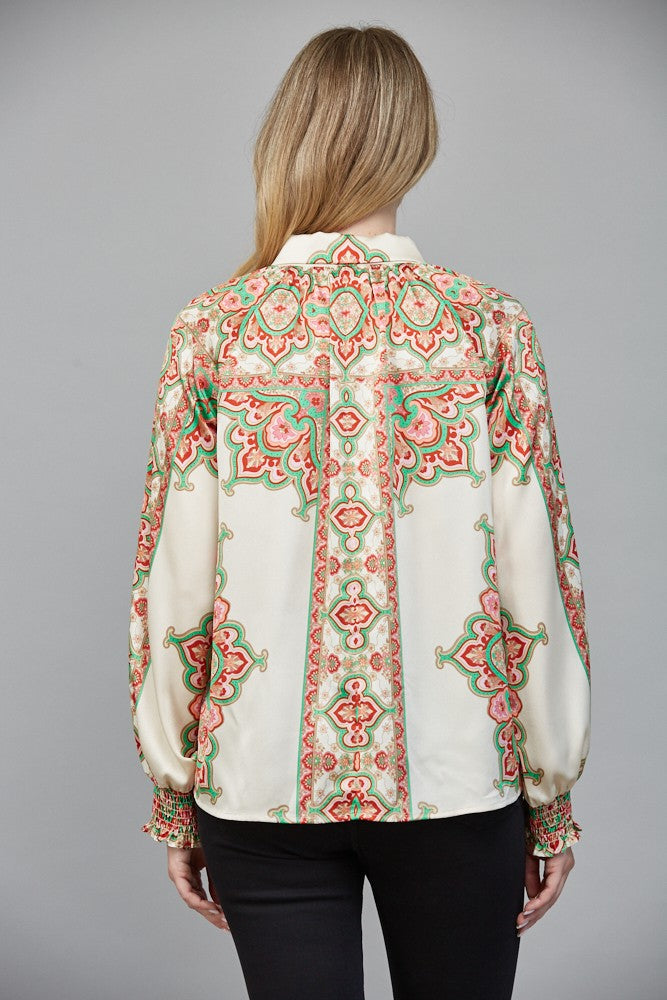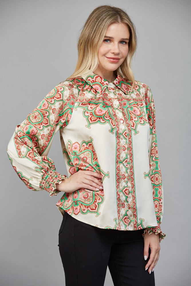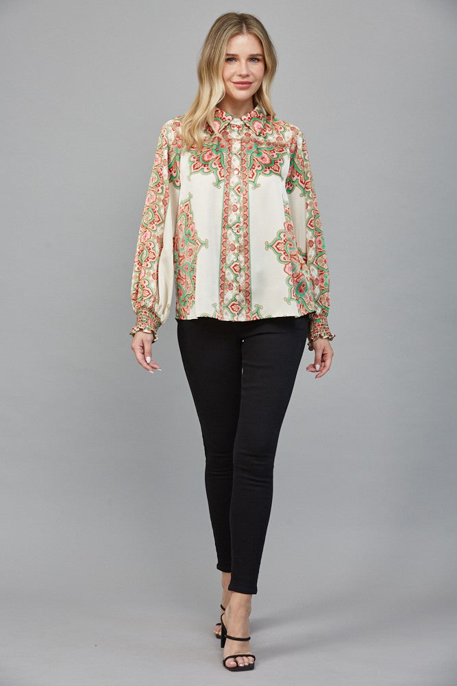 Effortlessly elegant, the Autumn Muse Abstract Blouse features a striking border print that adds artistic flair to a timeless silhouette. Designed with long sleeves and a classic button-front closure, this woven blouse blends sophistication with a relaxed, wearable fit. Perfect for pairing with denim or tailored trousers, it’s a versatile piece that transitions seamlessly from work to weekend with bold, modern style.