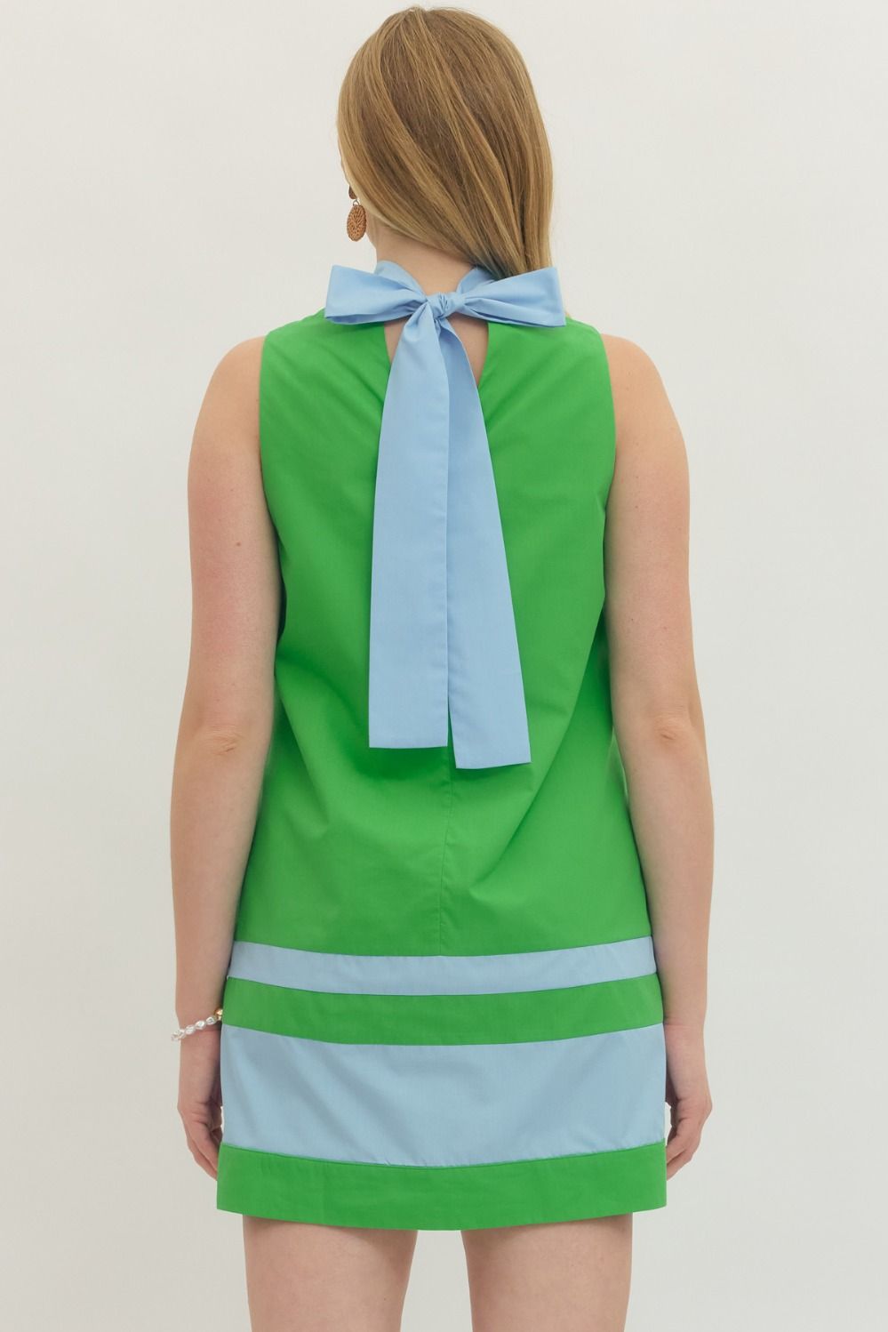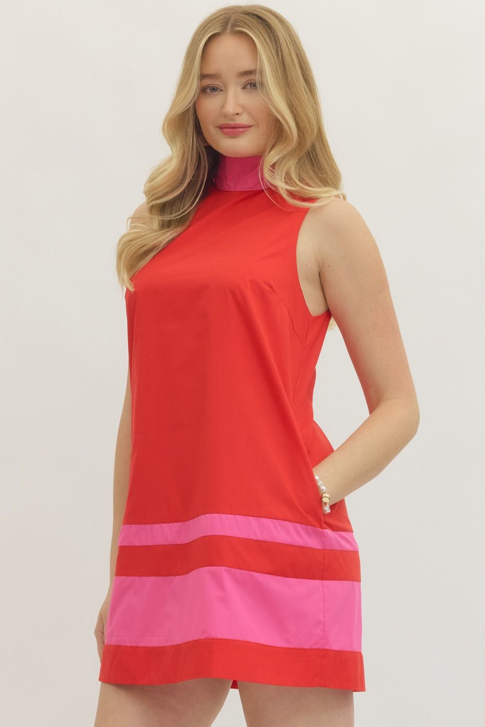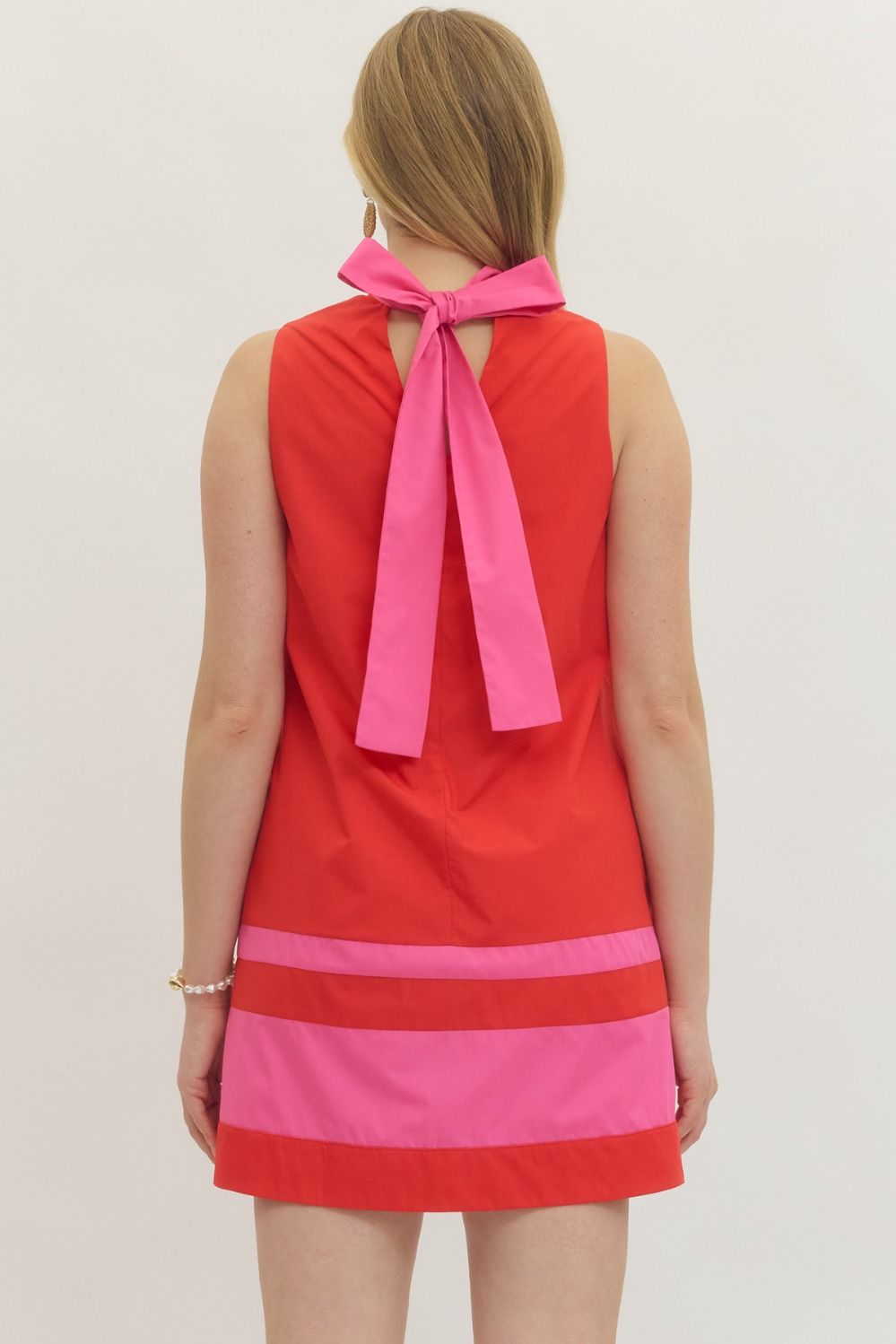 Step into effortless style with this sleeveless mini dress, designed with bold contrast banding for a modern twist. Features a tie closure at the back neckline, convenient side pockets, and a fully lined silhouette for a smooth, comfortable fit. Perfect for day-to-night wear.
