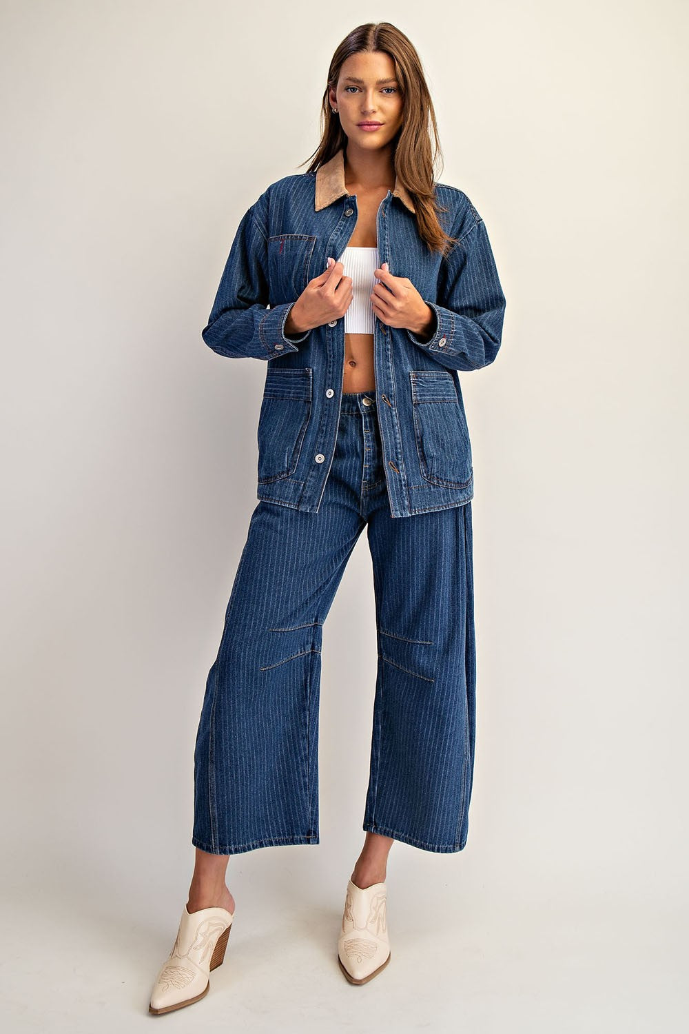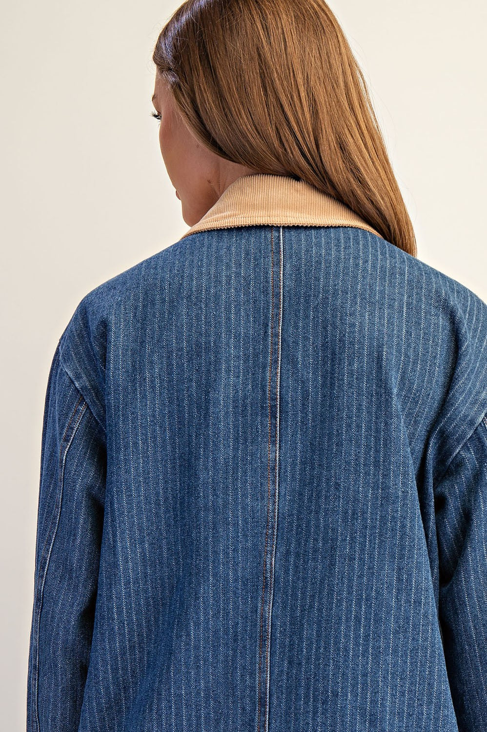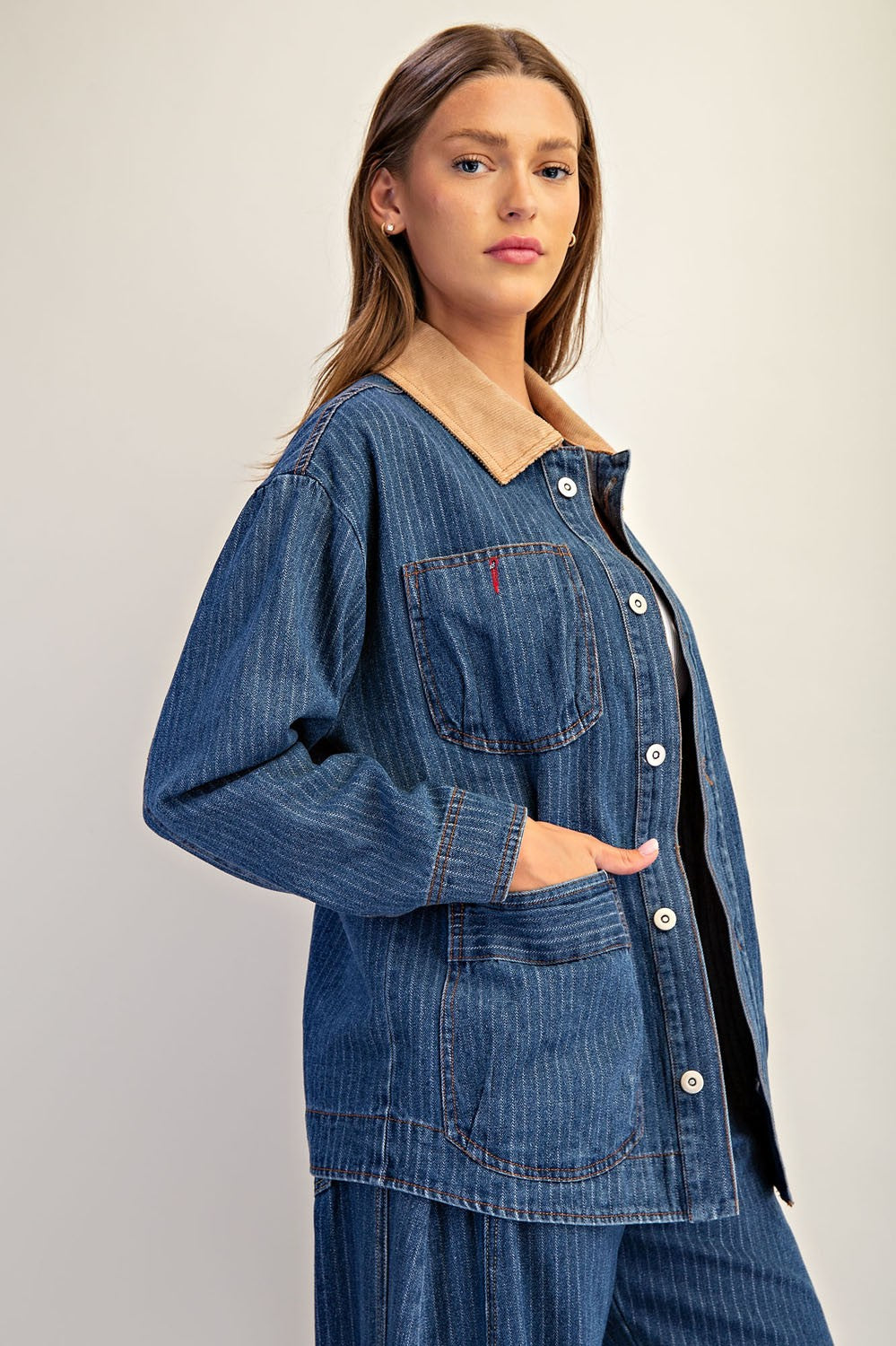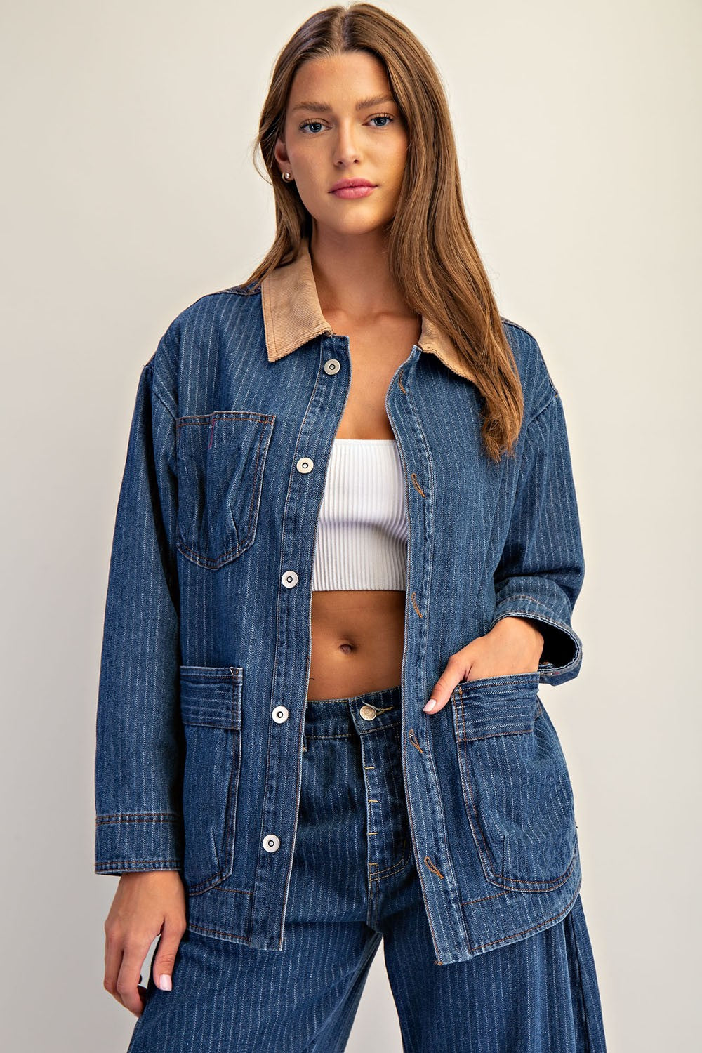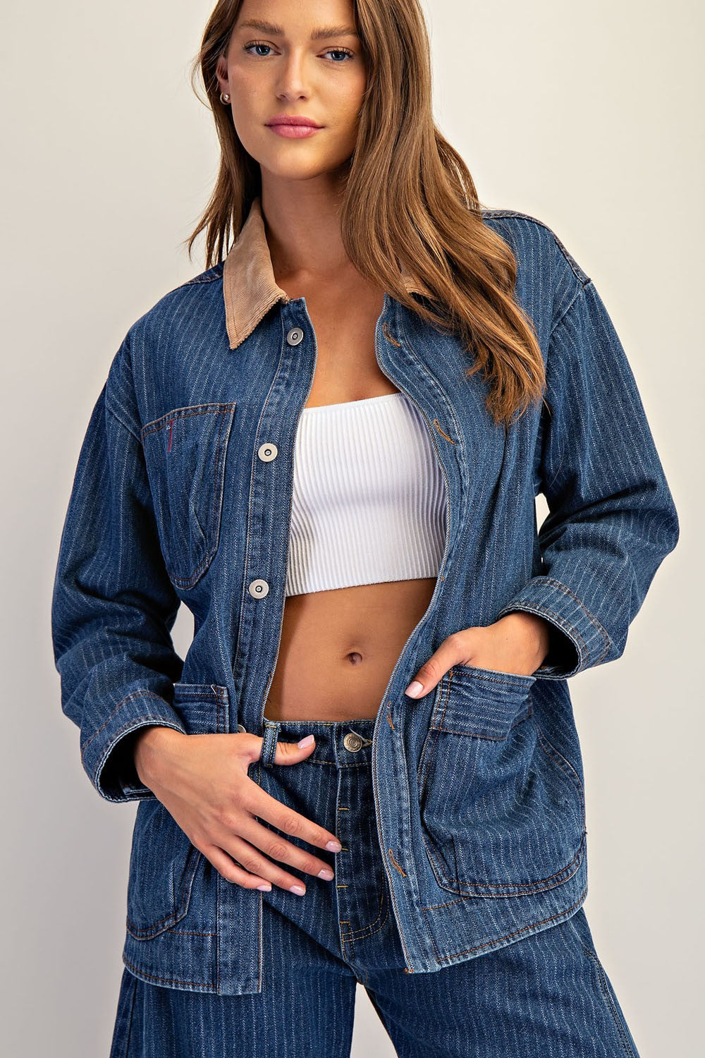 Classic workwear meets vintage charm in the Heritage Stripe Corduroy Collar Jacket. Designed with pinstriped denim and a contrasting corduroy collar, this jacket balances rugged style with refined detail. The button-front closure, buttoned cuffs, and dropped shoulders create a relaxed fit, while oversized waist pockets and a chest patch pocket with a subtle red accent tab add both function and flair. Finished with worn-in seaming, it’s the perfect throw-on layer for a utilitarian yet timeless look.