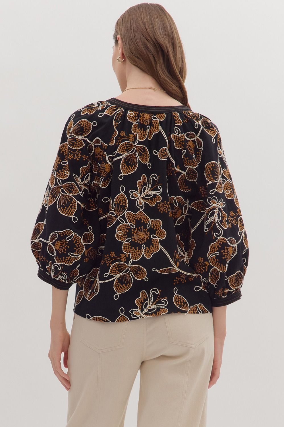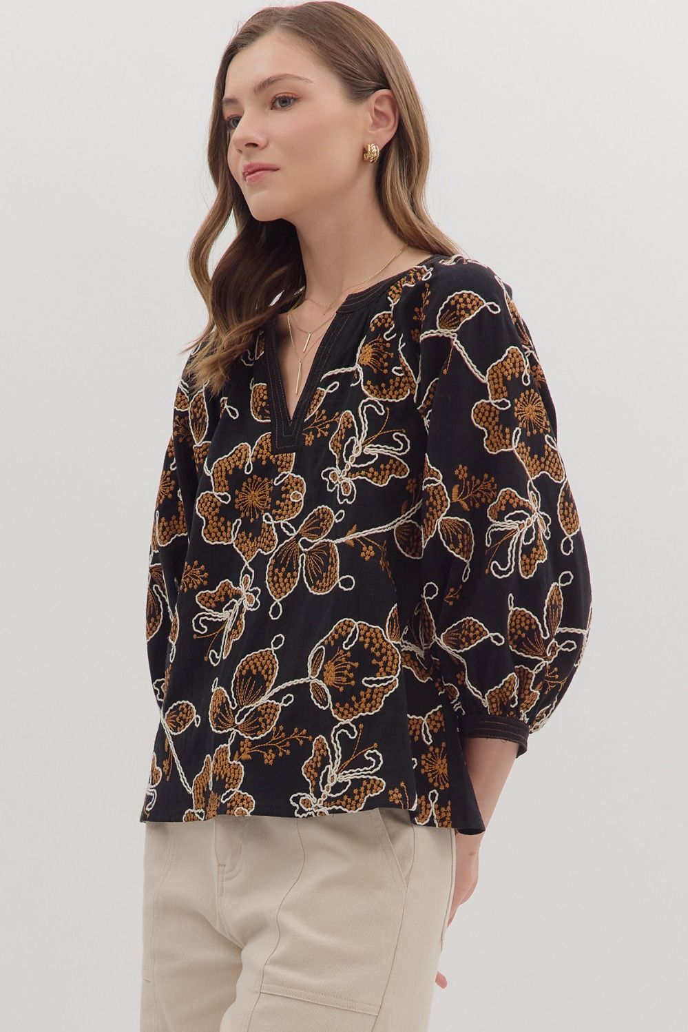 Add a touch of nature-inspired elegance with the Garden Muse V-Neck Top. Featuring delicate botanical embroidery, a flattering V-neckline with neat binding, and breezy 3/4 sleeves, this top is perfect for layering or wearing on its own for a polished, effortless look.