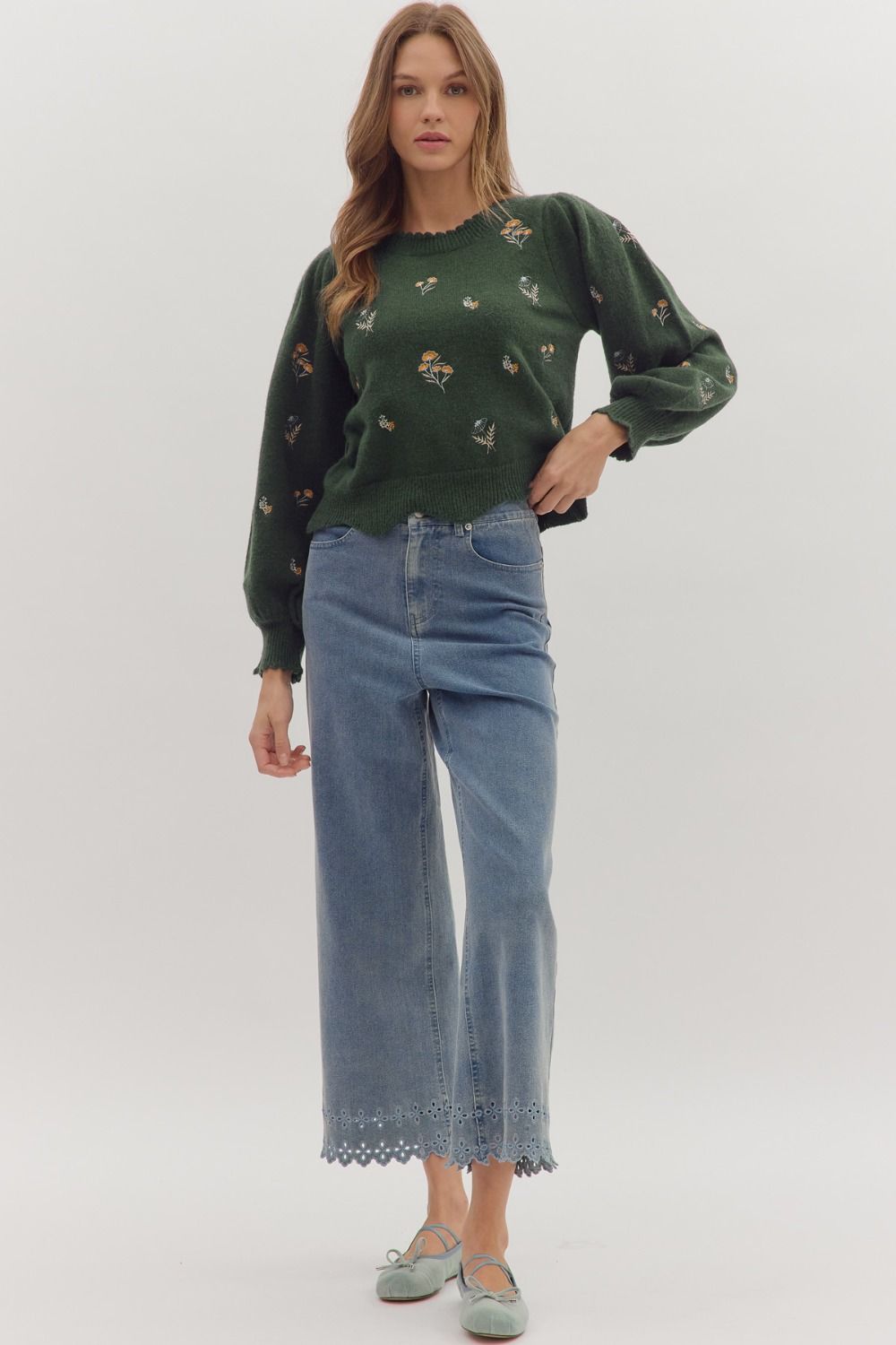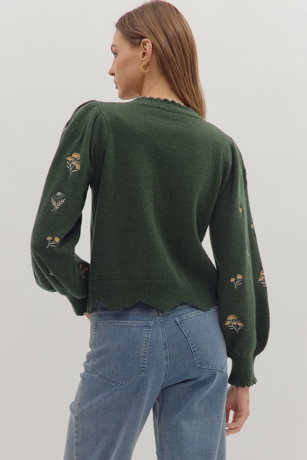 Embrace cozy elegance with the Autumn Bloom Scallop Hem Sweater. This charming knit features delicate floral embroidery and a graceful scalloped hem for a feminine fall touch. Designed with a classic round neckline and long sleeves, it blends warmth and style perfectly—ideal for pairing with your favorite jeans or layered over a skirt for a polished seasonal look.