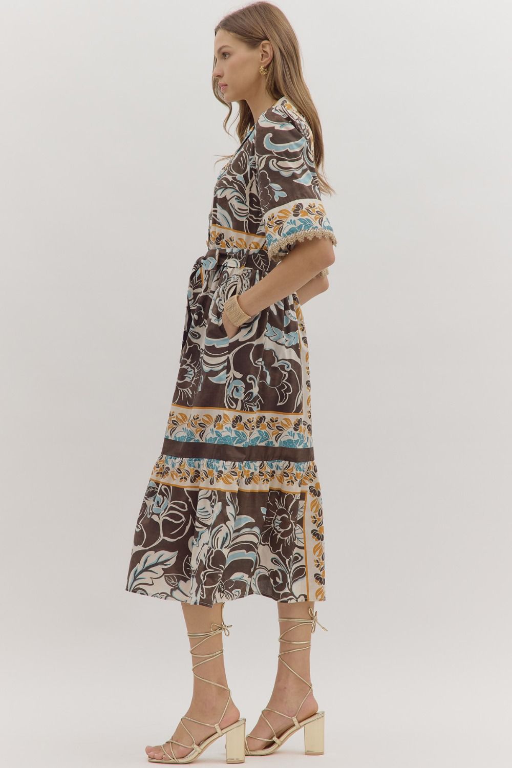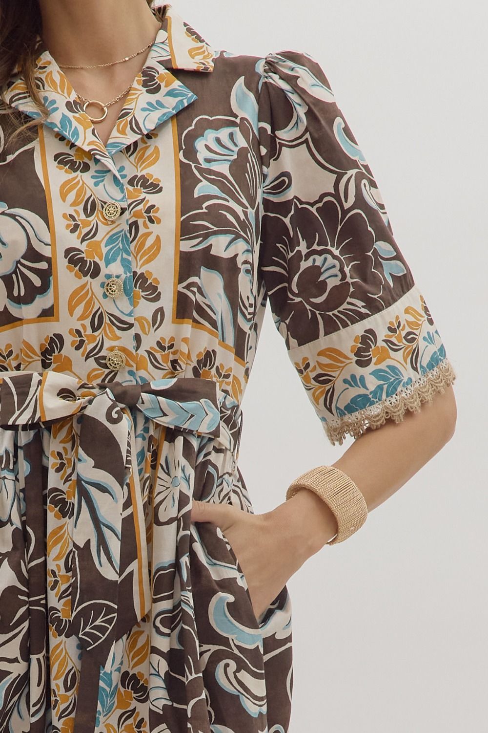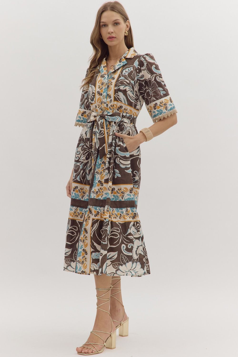 Step into effortless elegance with the Blooming Charm Floral Midi Dress. This short-sleeve midi features a playful floral print, a notched collar, and a self-tie waist for a flattering silhouette. Delicate lace trim at the sleeve openings, a front button closure, and practical side pockets add thoughtful details. Fully lined for comfort, it’s the perfect dress for daytime events or weekend outings.