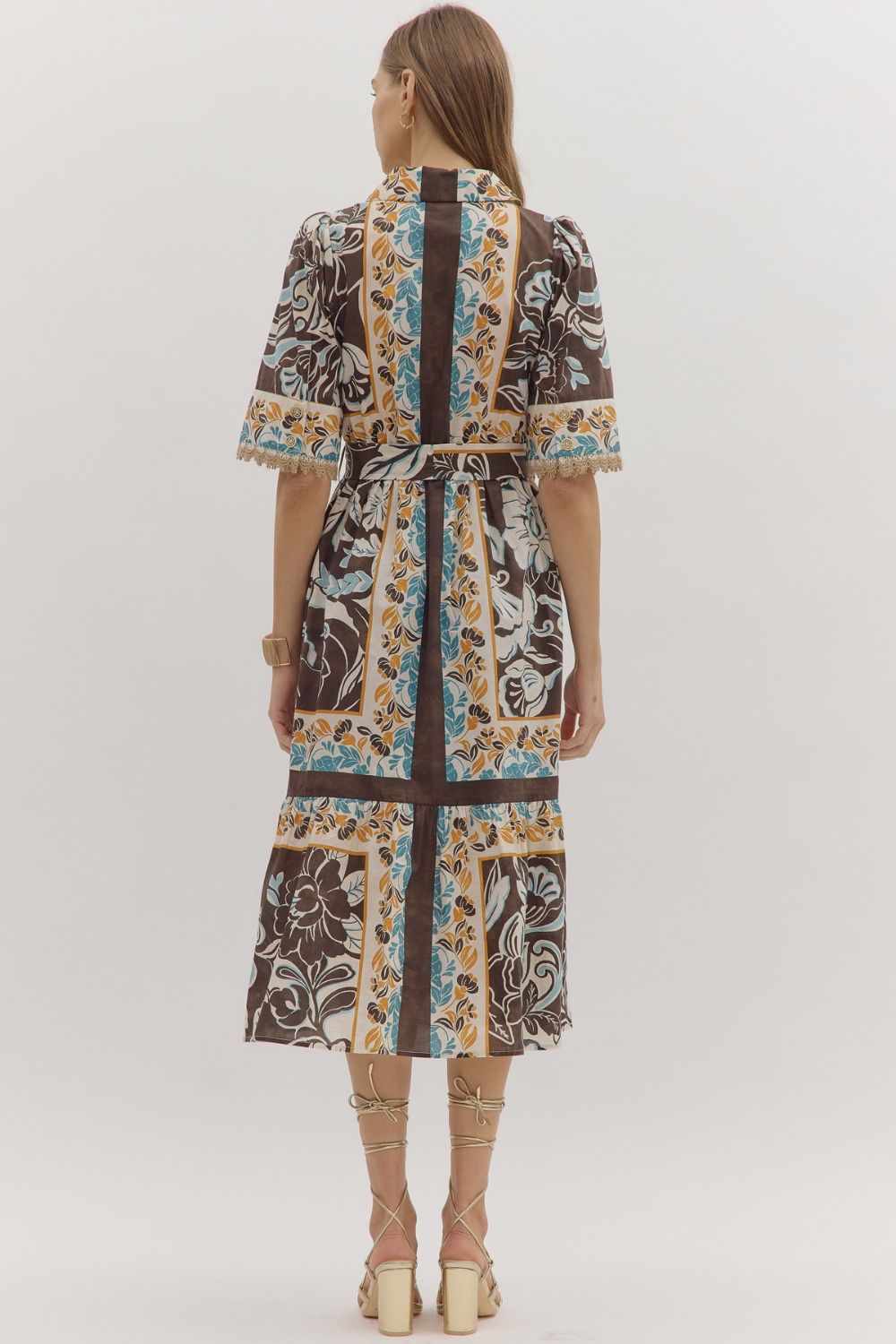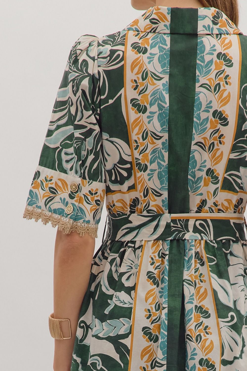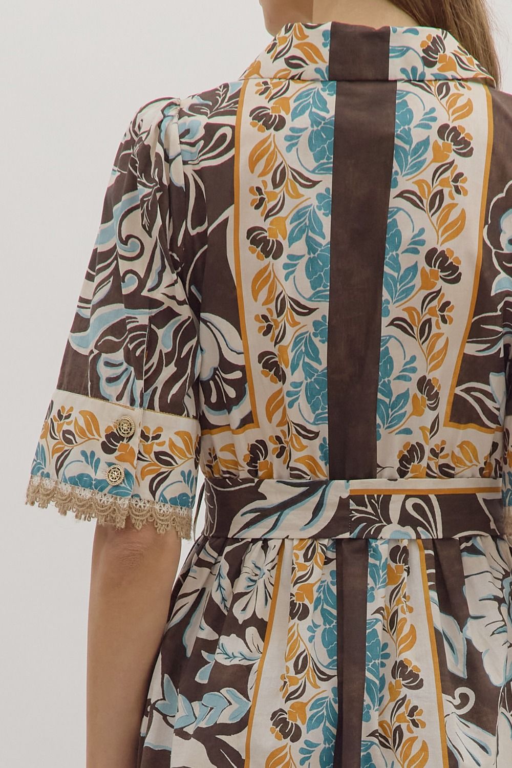 Step into effortless elegance with the Blooming Charm Floral Midi Dress. This short-sleeve midi features a playful floral print, a notched collar, and a self-tie waist for a flattering silhouette. Delicate lace trim at the sleeve openings, a front button closure, and practical side pockets add thoughtful details. Fully lined for comfort, it’s the perfect dress for daytime events or weekend outings.