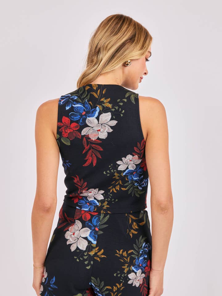Turn heads effortlessly with the Four Season High Neck Crop Top. Its bold floral print bursts vibrantly against a sleek black background, while the high neckline and cropped fit add a playful edge. Designed to flatter your figure, this top is perfect paired with the matching skirt or worn solo for a chic, confident look that’s ready for any occasion.