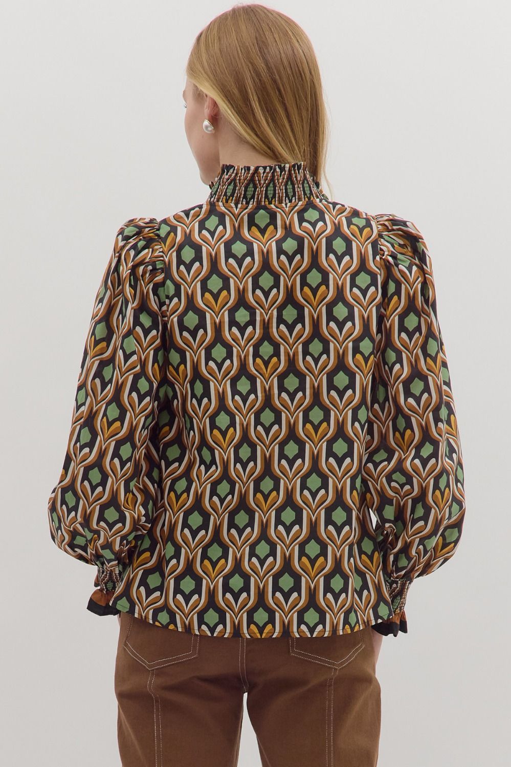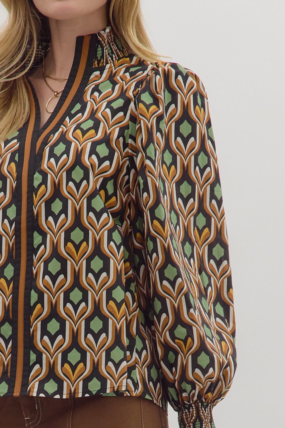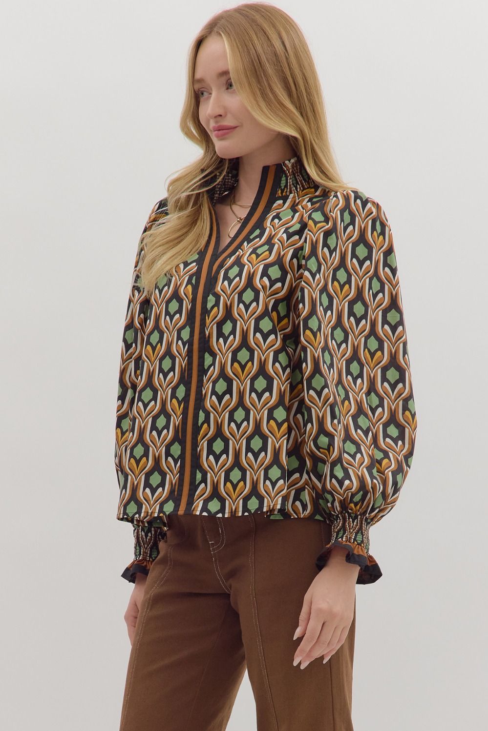 Bring a modern twist to your fall wardrobe with the Autumn Geo Split Neck Top. Featuring a bold geometric print, contrast trim split neckline, and smocked mock neck and cuffs, this long sleeve top balances cozy comfort with standout style—perfect for layering or wearing on its own during crisp autumn days.