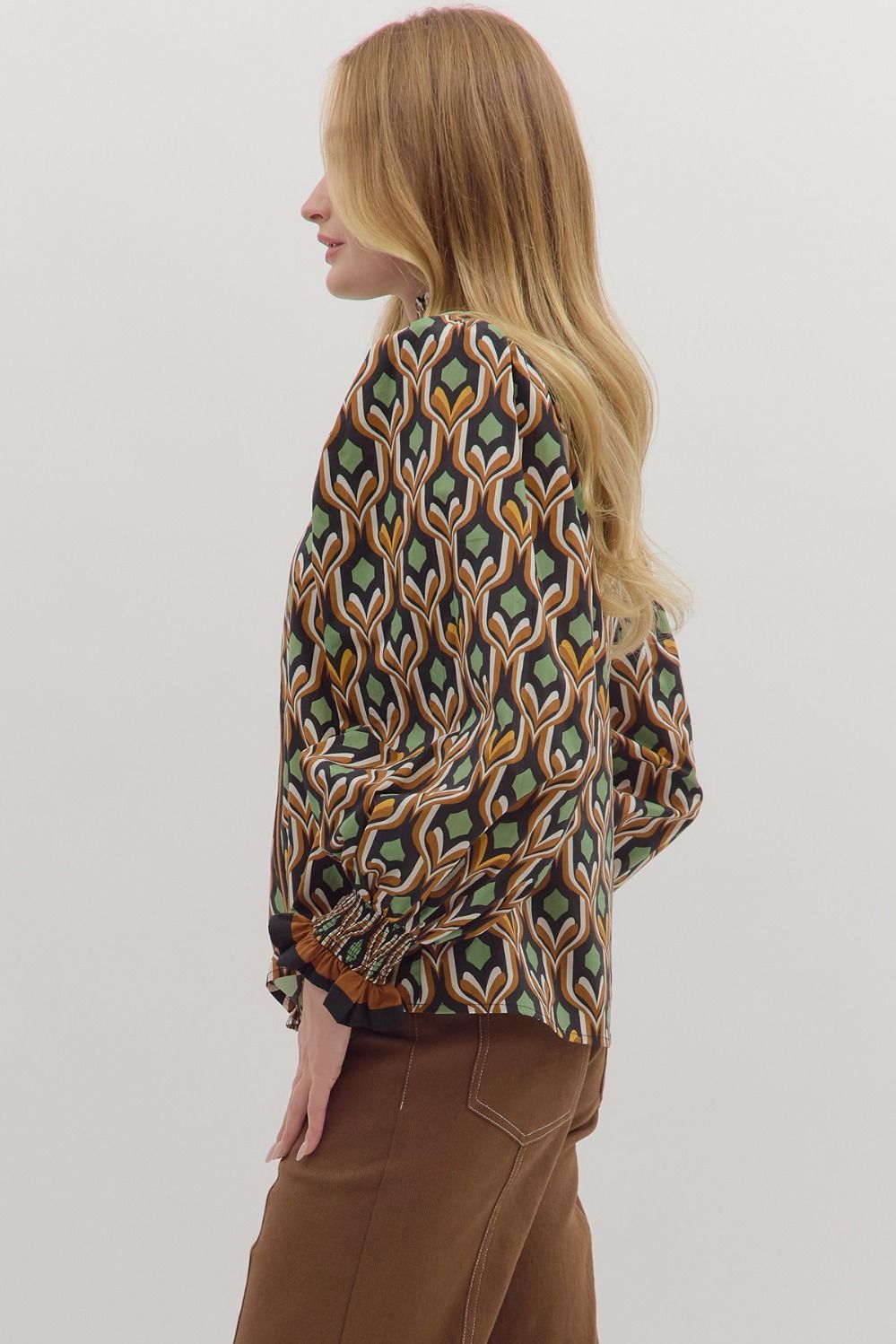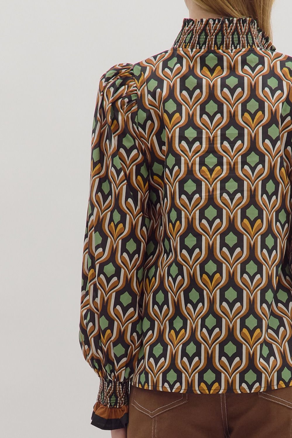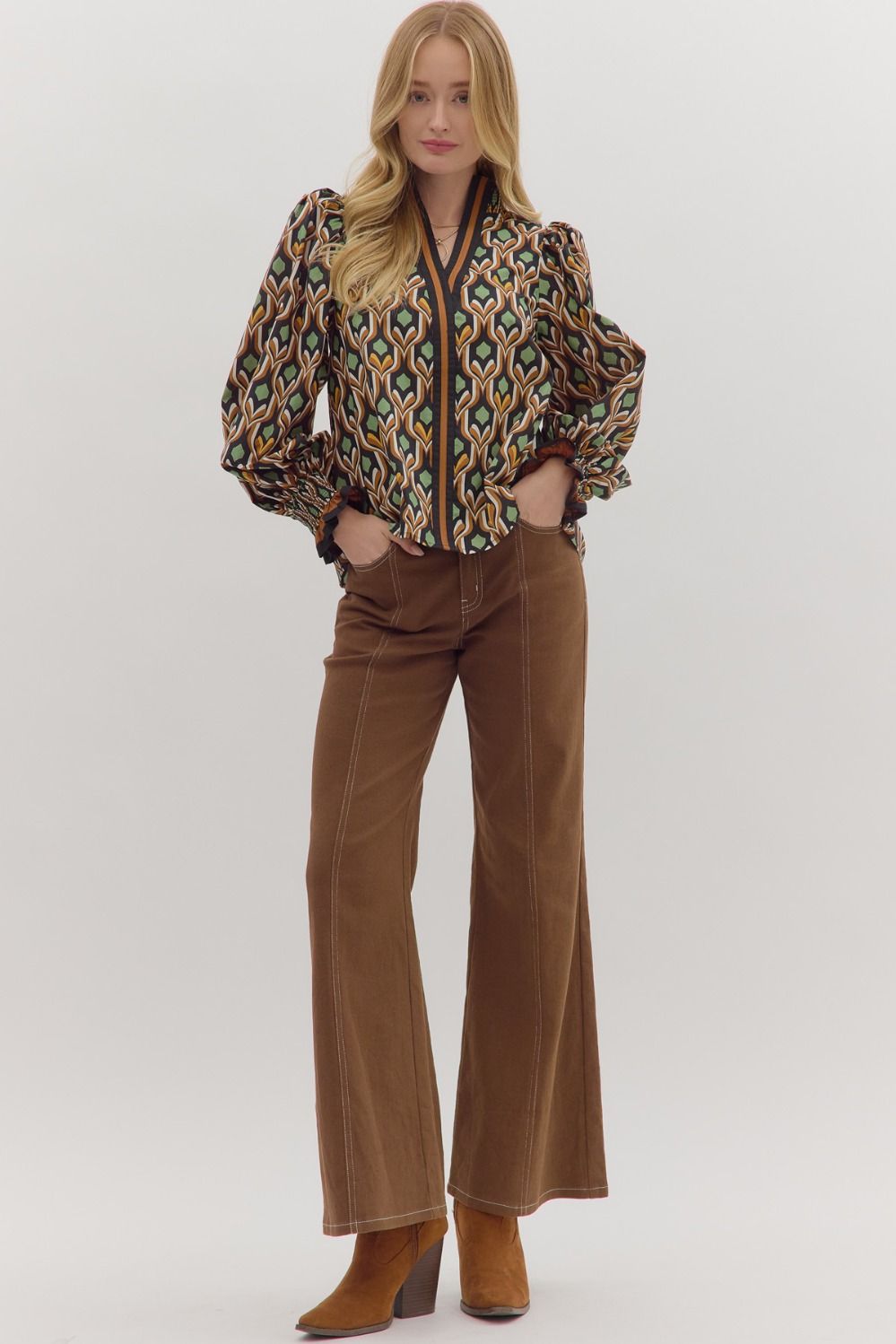 Bring a modern twist to your fall wardrobe with the Autumn Geo Split Neck Top. Featuring a bold geometric print, contrast trim split neckline, and smocked mock neck and cuffs, this long sleeve top balances cozy comfort with standout style—perfect for layering or wearing on its own during crisp autumn days.