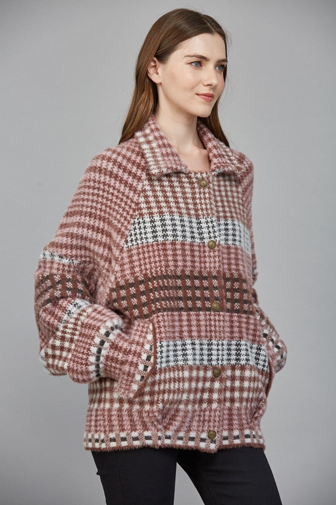 Stay warm in style with the Cozy Plaid Fuzzy Jacket. Featuring a classic plaid pattern and a button-front closure, this fuzzy sweater jacket offers a soft, comforting feel with effortless fall charm. Perfect for layering over tees, blouses, or lightweight sweaters, it pairs seamlessly with jeans or leggings for a cozy, casual look.