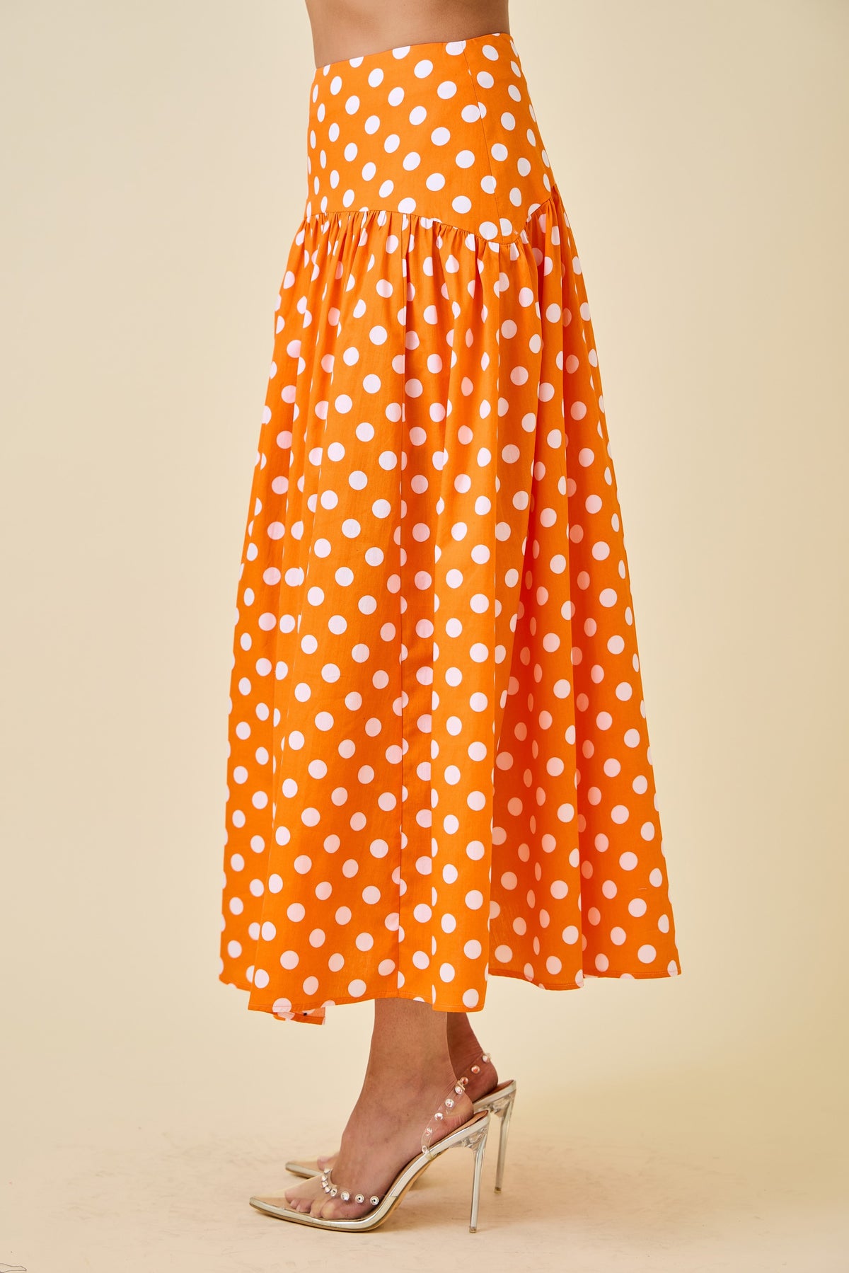 Turn heads on game day in the Rocky Top Polka Dot Maxi Skirt. Designed with a flared silhouette and curved yoke for a flattering fit, this orange-and-white beauty brings playful charm to your Volunteer style. Pair it with the matching top for the ultimate coordinated look that’s bold, breezy, and perfect for showing your Tennessee spirit.