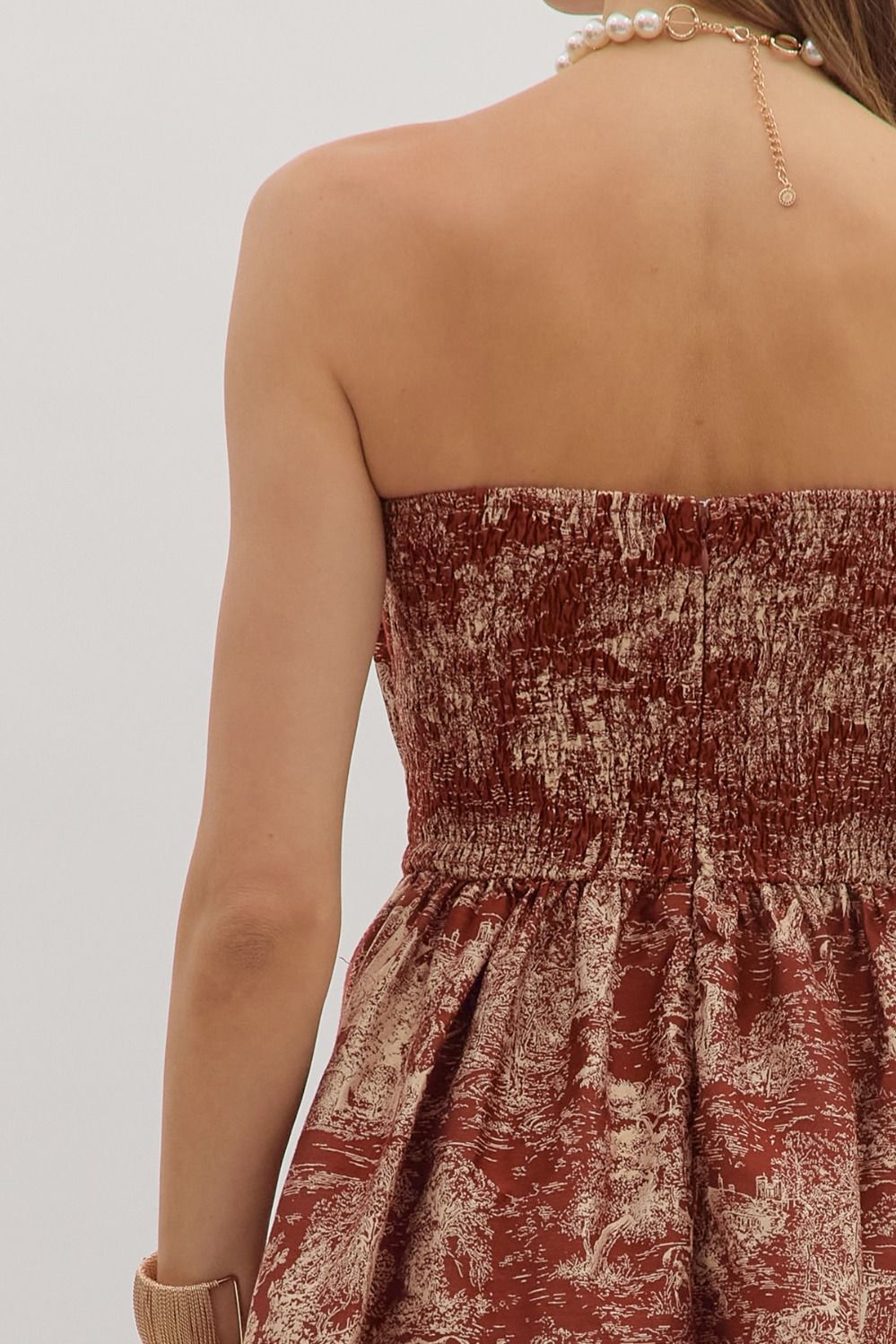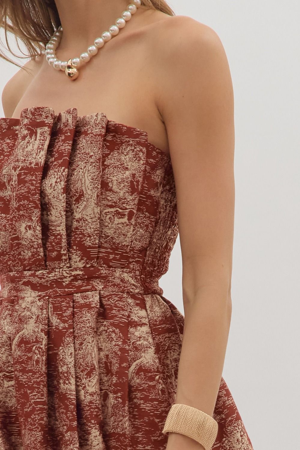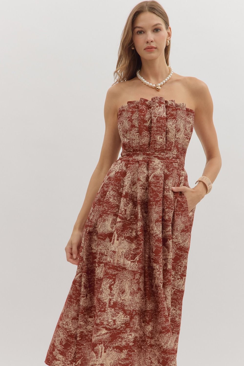 Step into holiday charm with the Festive Ruffle Strapless Midi Dress. This printed midi dress features a flirty ruffled straight neckline and a pleated skirt for effortless movement. The smocked back panel ensures a comfortable fit, while a hidden back zip makes dressing easy. Complete with convenient side pockets, this dress is perfect for holiday parties, gatherings, or any festive occasion.
