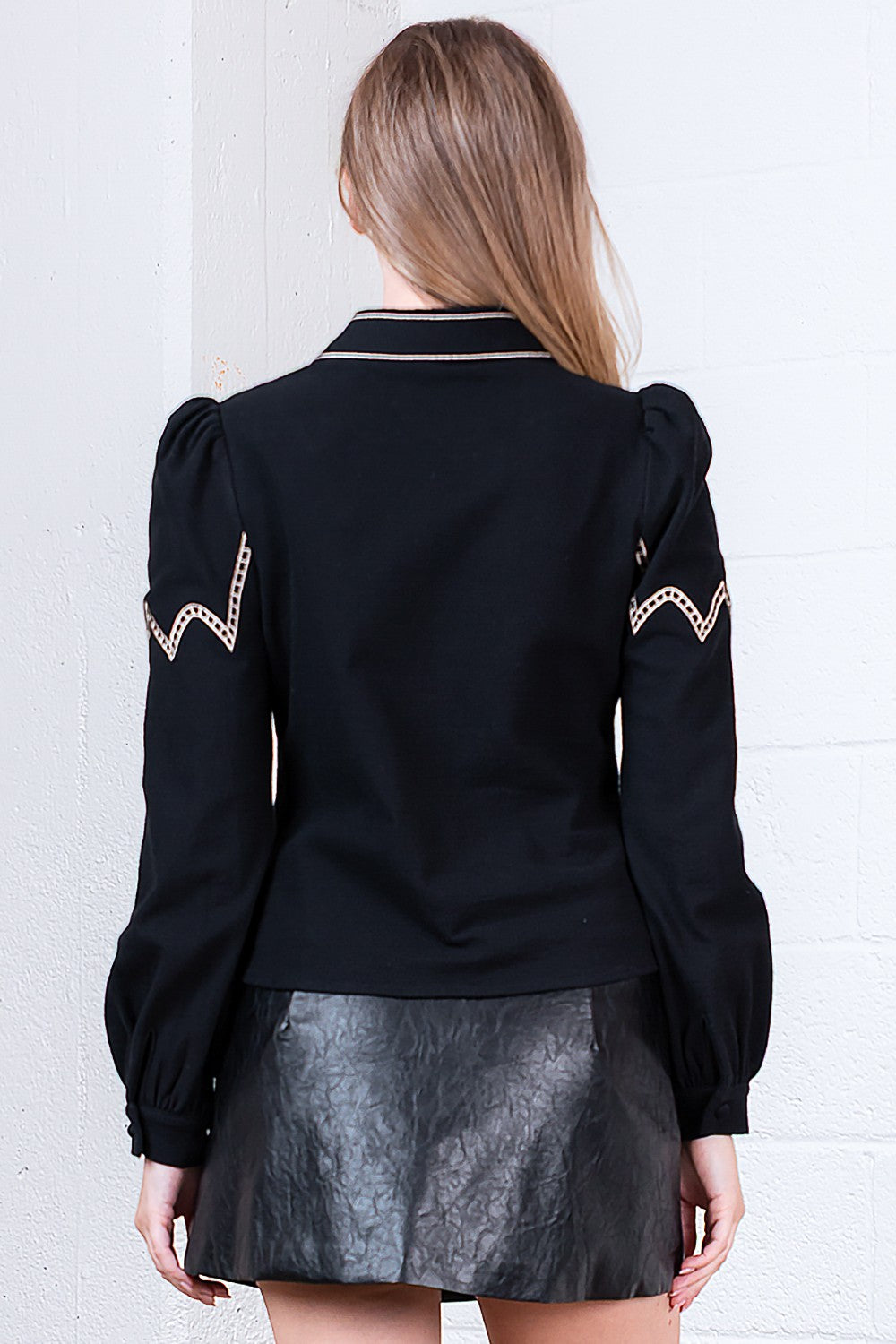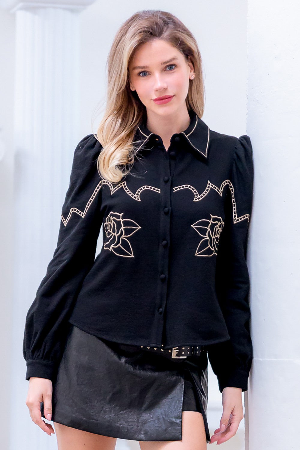 This playful black blouse features delicate rose embroidery that adds a touch of whimsy to its soft fabric. Designed with a relaxed fit, long sleeves, and a classic collared button-down style, it effortlessly blends comfort with charm. Perfect for adding a subtle floral flair to your everyday look.