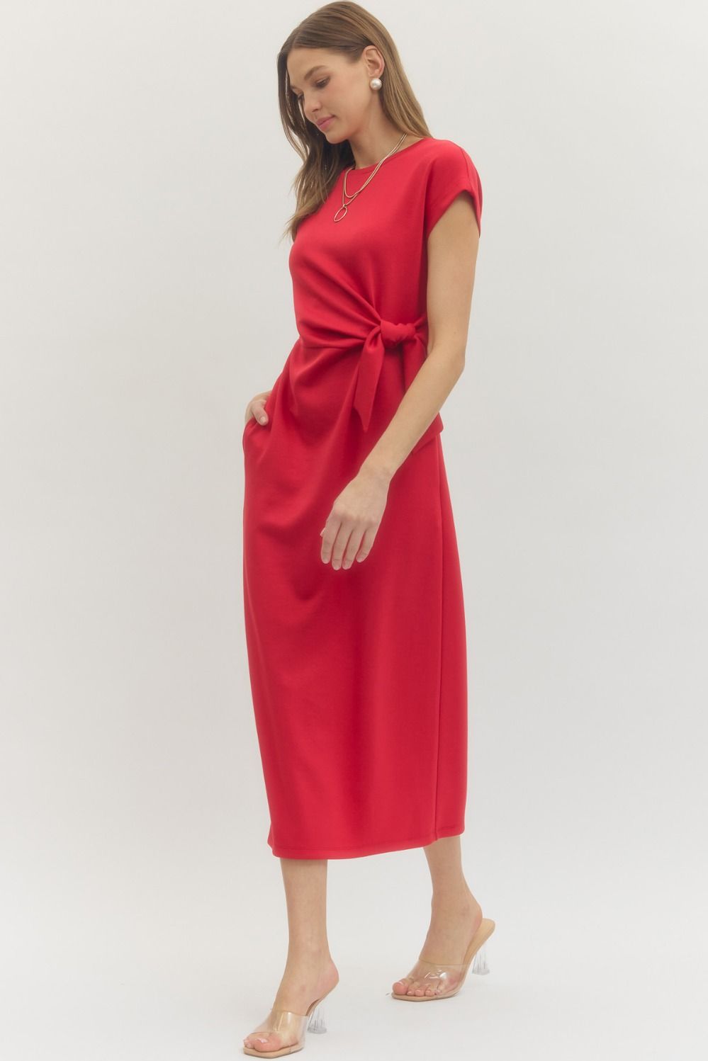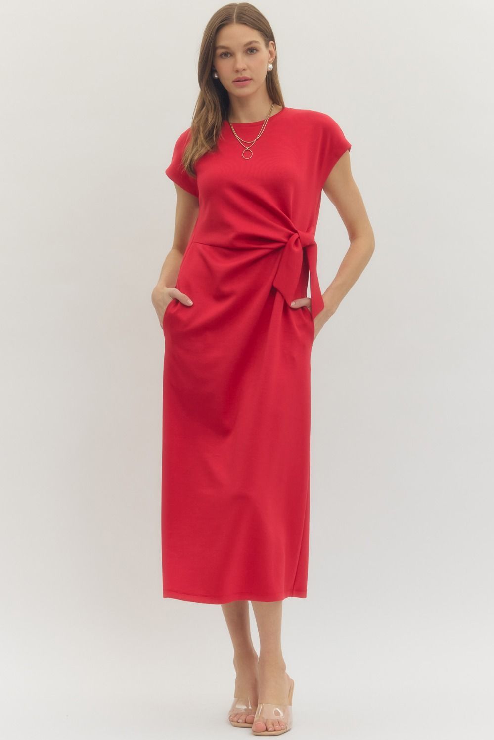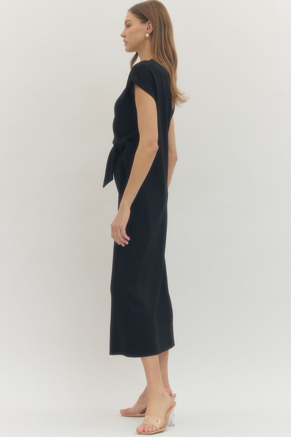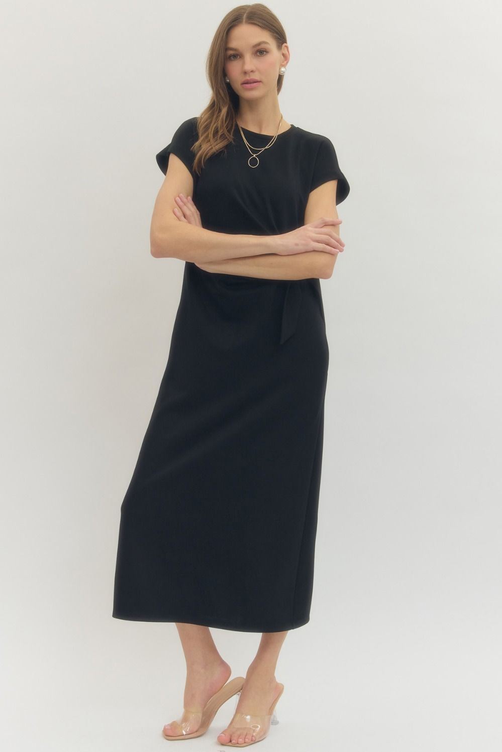 Sleek and endlessly wearable, this solid short sleeve maxi dress features a flattering wrap-style side tie at the waist for an adjustable, feminine fit. Designed with relaxed dolman sleeves finished with clean cuffs, it offers an easy drape and modern polish. Side pockets add everyday functionality, making this versatile piece perfect for casual days, workwear, or dressed-up evenings.
