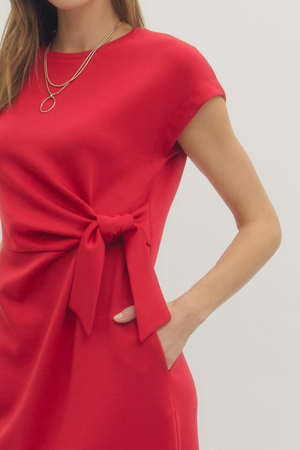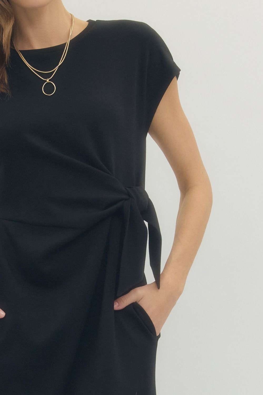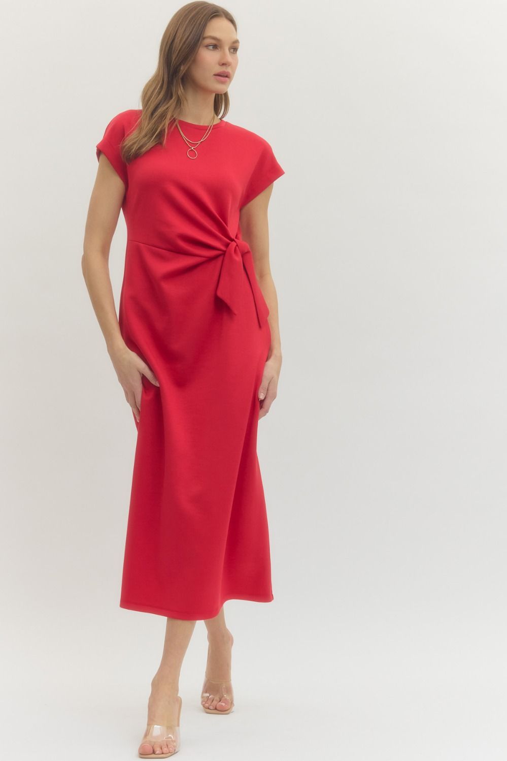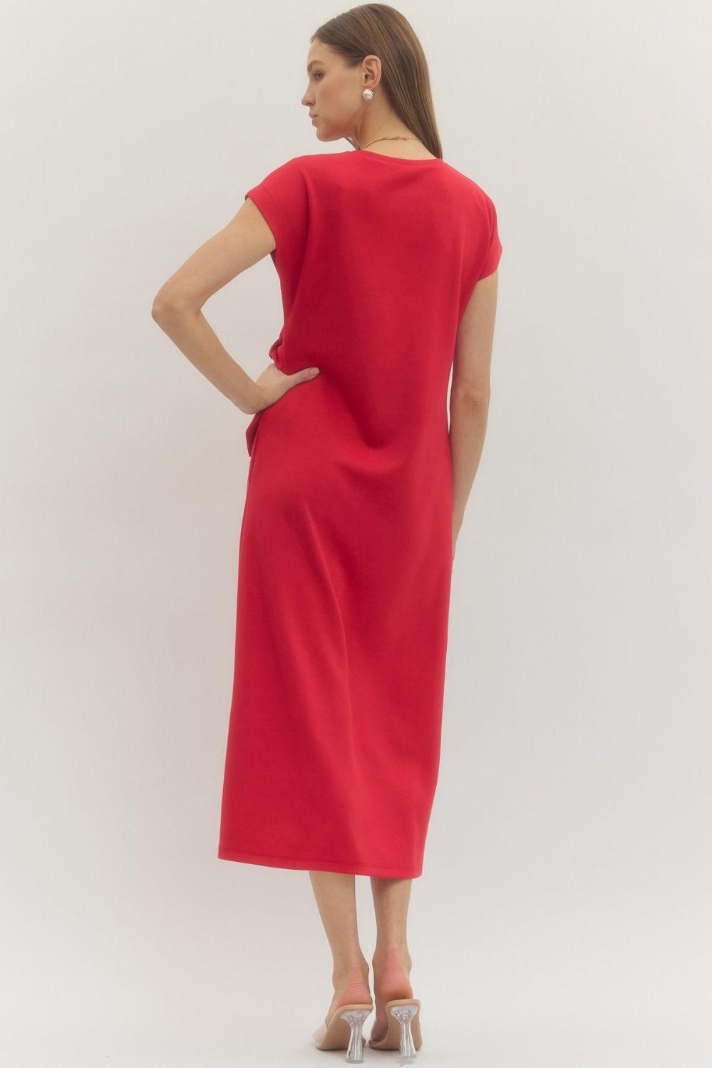 Sleek and endlessly wearable, this solid short sleeve maxi dress features a flattering wrap-style side tie at the waist for an adjustable, feminine fit. Designed with relaxed dolman sleeves finished with clean cuffs, it offers an easy drape and modern polish. Side pockets add everyday functionality, making this versatile piece perfect for casual days, workwear, or dressed-up evenings.